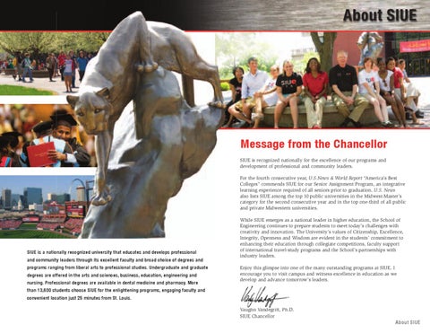 than 13,600 students choose SIUE for the enlightening programs, engaging faculty and convenient location just 25 minutes from St. Louis. Vaughn Vandegrift, Ph.D. SIUE Chancellor