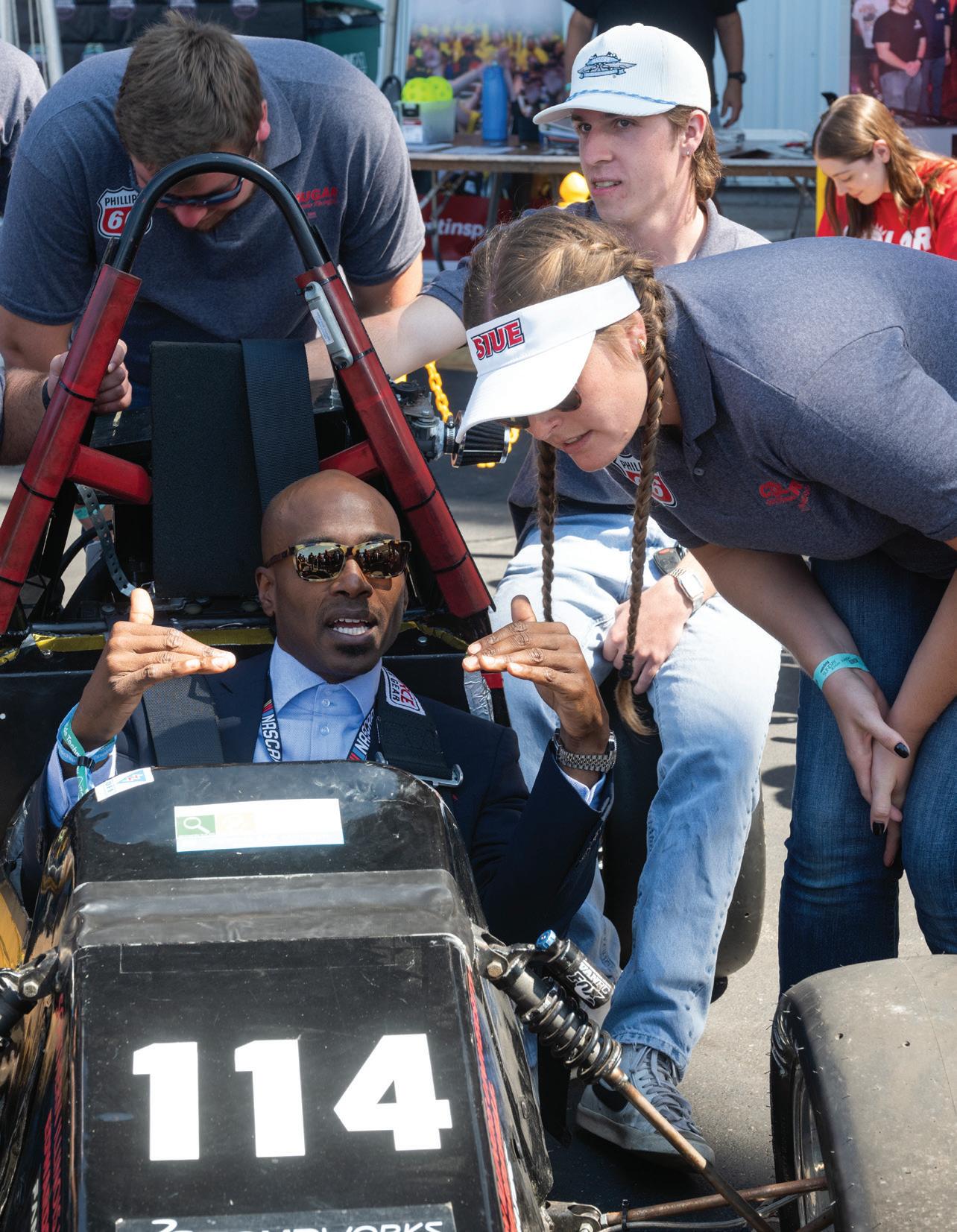 The car’s debut was made possible by the team’s skills, oldfashioned elbow grease, and critical donor support. Utility company Ameren Illinois pledged $40,000 to the team during the One Day One SIUE fundraising event, and Lewis and Clark Community College partnered with the team to weld the vehicle’s steel frame.