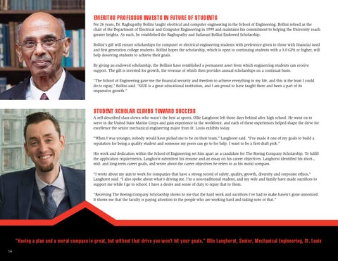 EMERITUS PROFESSOR INVESTS IN FUTURE OF STUDENTS For 26 years, Dr. Raghupathy Bollini taught electrical and computer engineering in the School of Engineering. Bollini retired as the chair of the Department of Electrical and Computer Engineering in 1999 and maintains his commitment to helping the University reach greater heights. As such, he established the Raghupathy and Sailarani Bollini Endowed Scholarship. Bollini’s gift will ensure scholarships for computer or electrical engineering students with preference given to those with financial need and first generation college students. Bollini hopes the scholarship, which is open to continuing students with a 3.0 GPA or higher, will help deserving students to achieve their goals. By giving an endowed scholarship, the Bollinis have established a permanent asset from which engineering students can receive support. The gift is invested for growth, the revenue of which then provides annual scholarships on a continual basis. “The School of Engineering gave me the financial security and freedom to achieve everything in my life, and this is the least I could do to repay,” Bollini said. “SIUE is a great educational institution, and I am proud to have taught there and been a part of its impressive growth.”