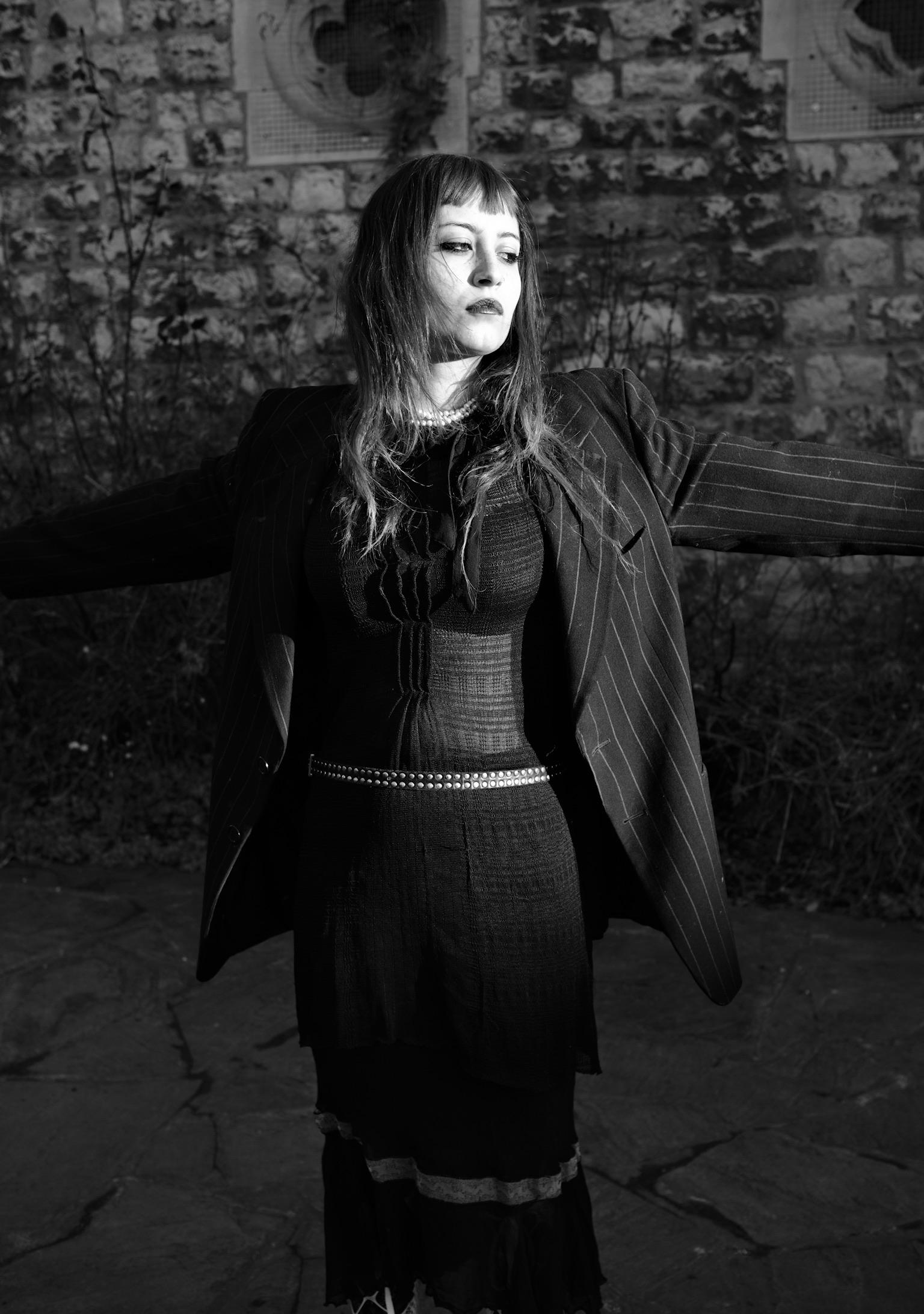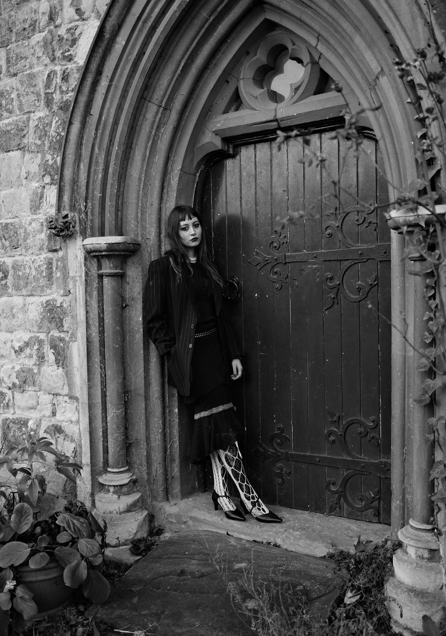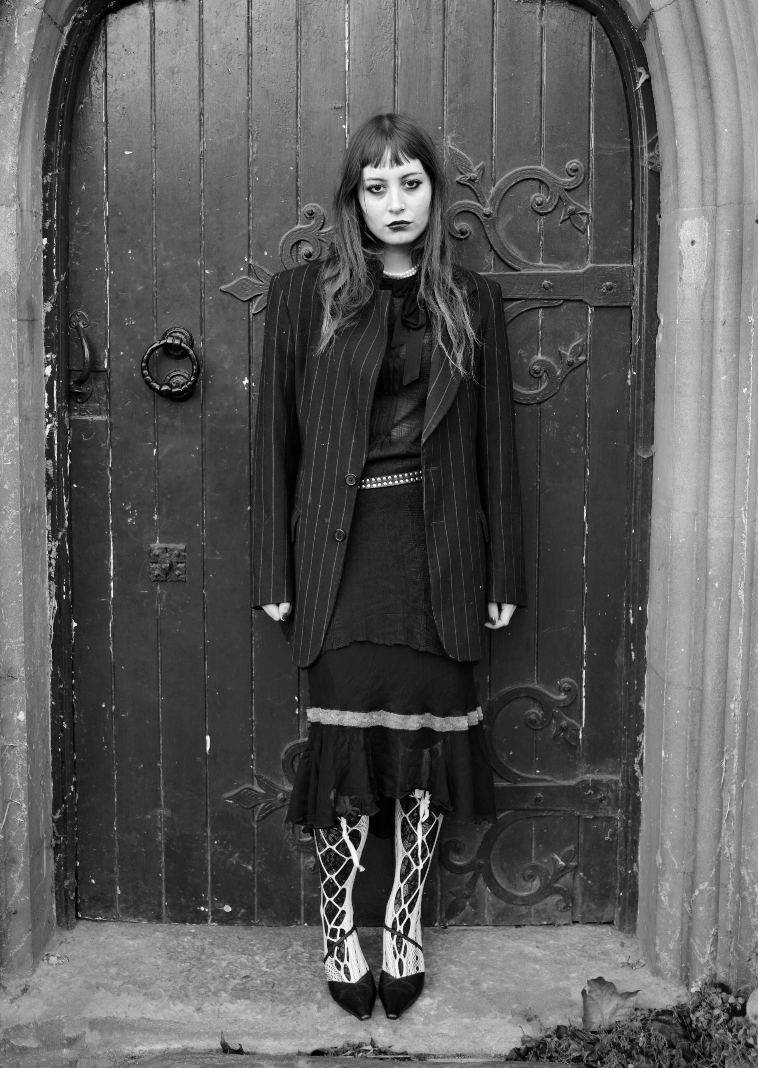 Taking inspsiration from 80’s goth icon Siouxsie Sioux, I wanted the look to cross btween and combine both masculine and feminie styles. Layering differenet textures and fabrics with fish net tights and a pearl necklace, finishing the look with a mens vintage pinstripe blazer. Creating a boxy, powerful shilouette over quite delicate under layers of mesh and lace. Minna wears a pair of vintage kitten heels over patterned tights with lace up socks. Contrasting layers of black and white.