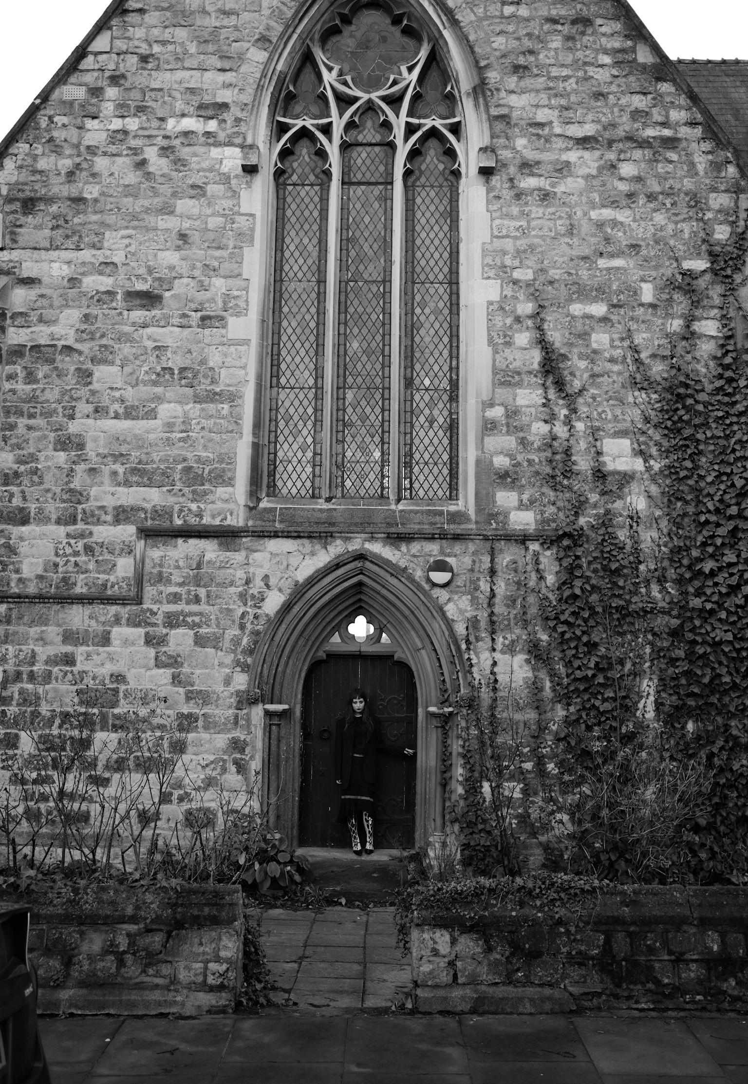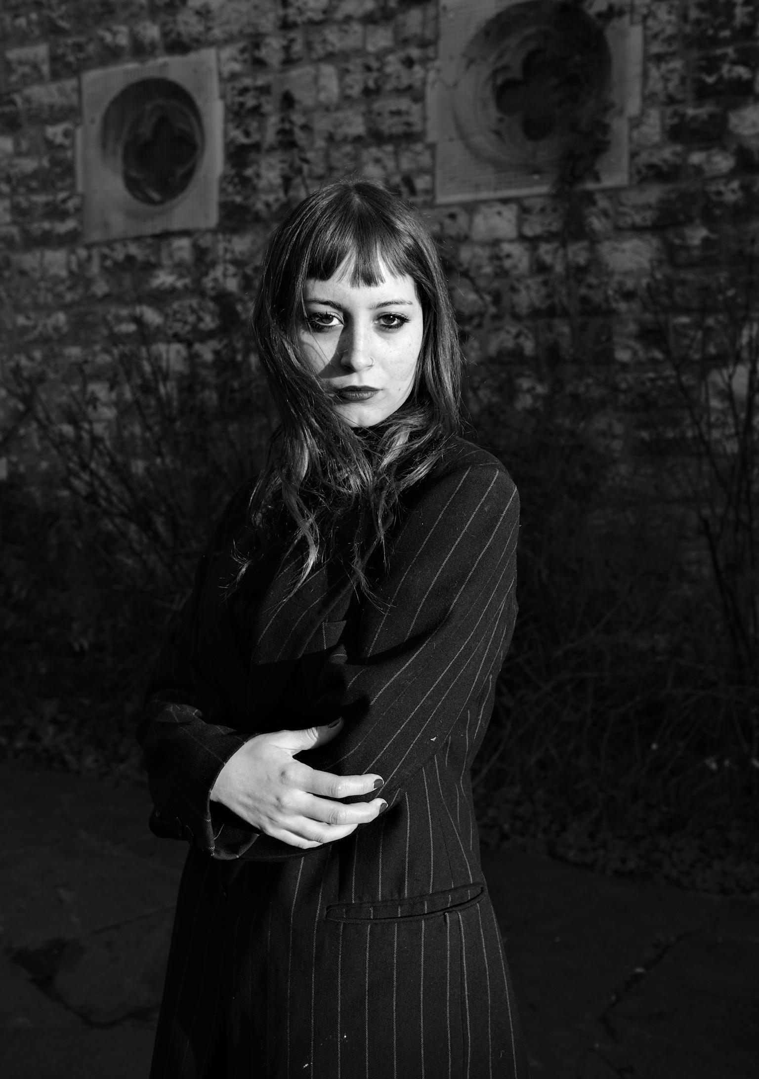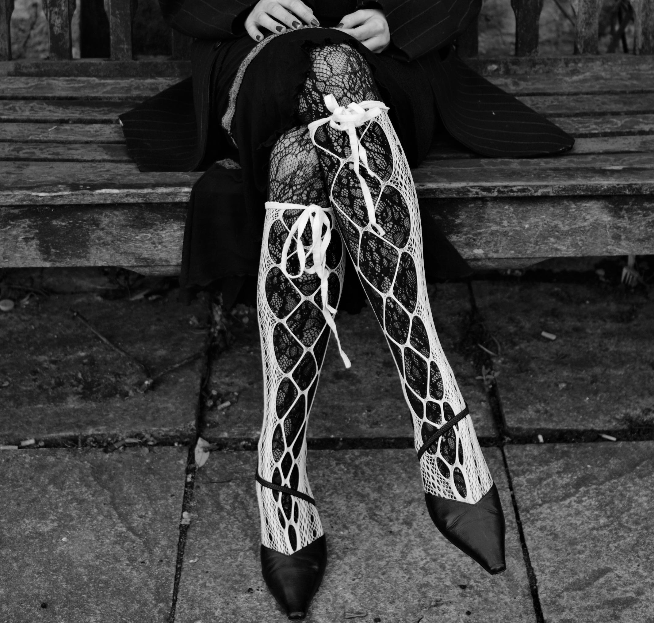 Taking inspsiration from 80’s goth icon Siouxsie Sioux, I wanted the look to cross btween and combine both masculine and feminie styles. Layering differenet textures and fabrics with fish net tights and a pearl necklace, finishing the look with a mens vintage pinstripe blazer. Creating a boxy, powerful shilouette over quite delicate under layers of mesh and lace. Minna wears a pair of vintage kitten heels over patterned tights with lace up socks. Contrasting layers of black and white.