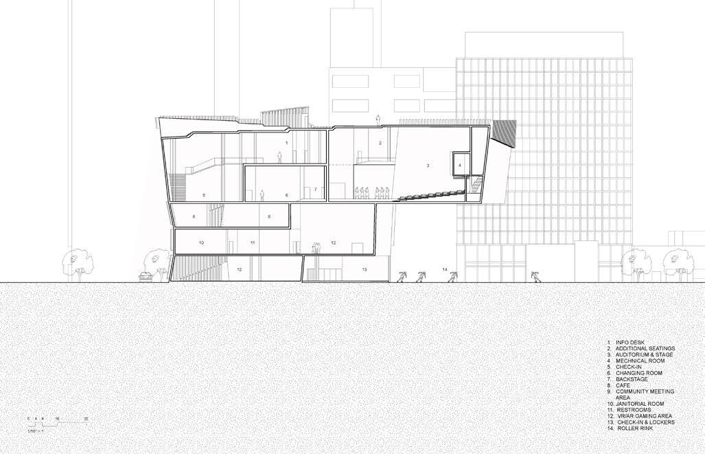 The FunZone Center is a recreational facility with a diverse range of programmatic elements strategically placed on different floors to enhance the visitor experience. The ground level features a roller rink, while levels 1 and 2 are designed for VR/AR gaming spaces, and an auditorium is located on level 4, making recreation the focal point of the building.