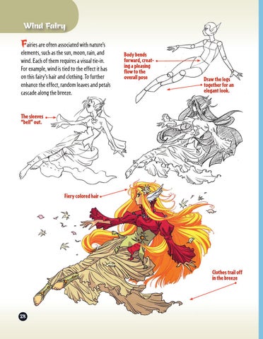 elements, such as the sun, moon, rain, and wind. Each of them requires a visual tie-in. For example, wind is tied to the effect it has on this fairy’s hair and clothing. To further enhance the effect, random leaves and petals cascade along the breeze.