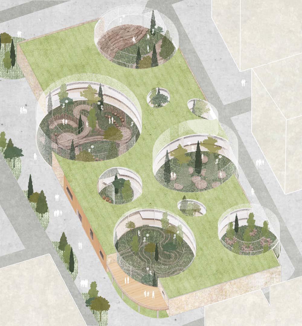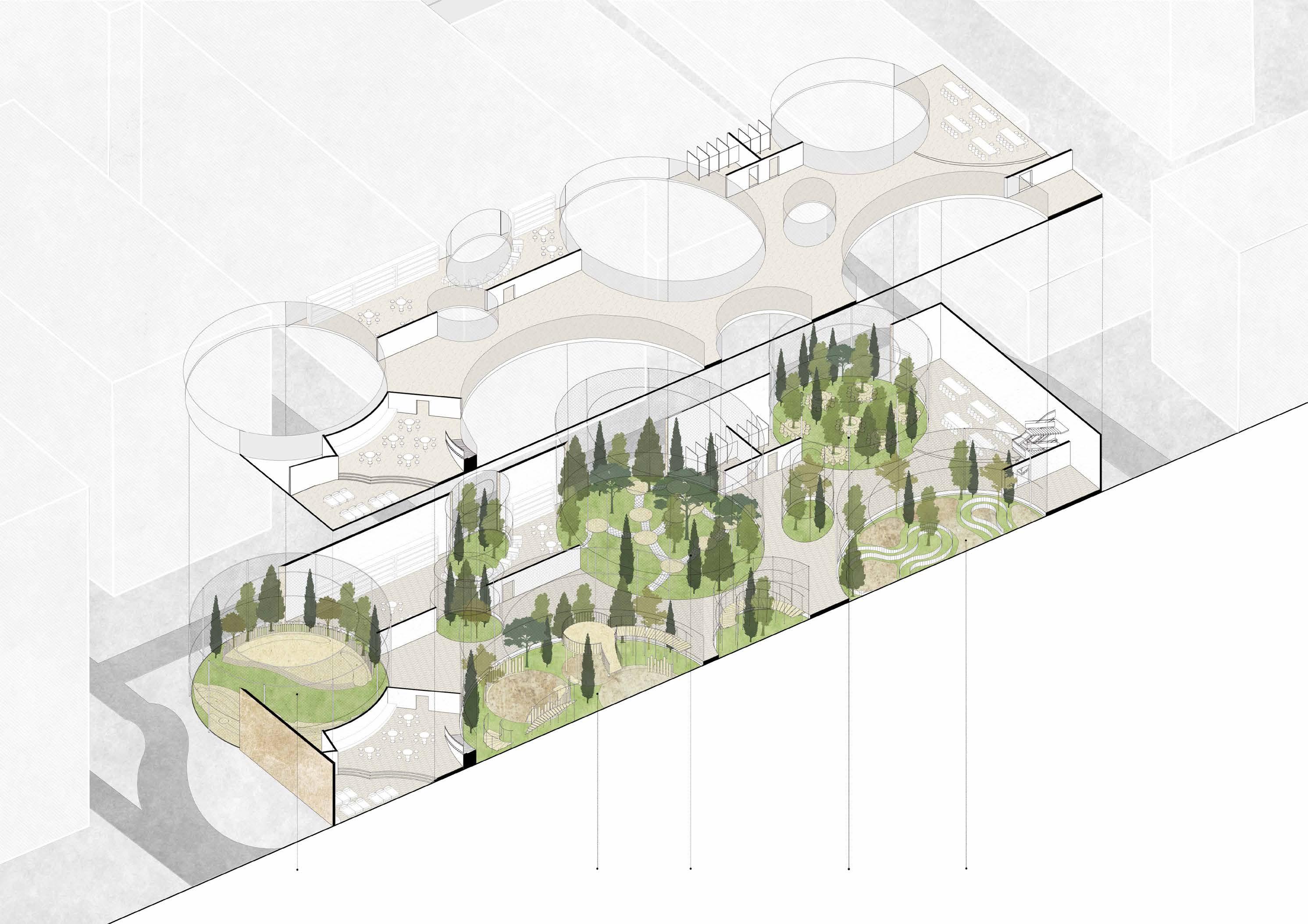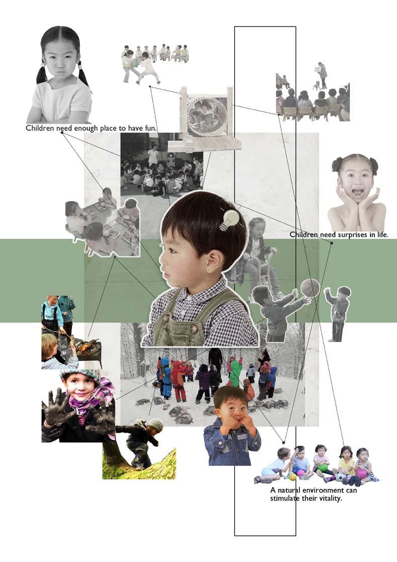 Beijing's old urban areas now face problems such as crumbling infrastructure and lack of greenery. Kindergartens in old neighborhoods also lack space for children to play, and the buildings are not aesthetically pleasing. Taking into account that children will have an impressive experience if they could learn and grow in a natural environment, i introduced the concept of a forest kindergarten in this project. And the aim is to provide children in the community with a forest-like environment where they can play freely and have fun.