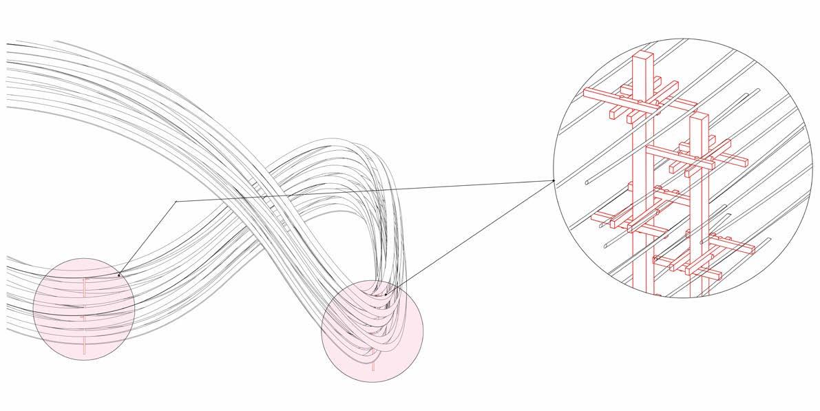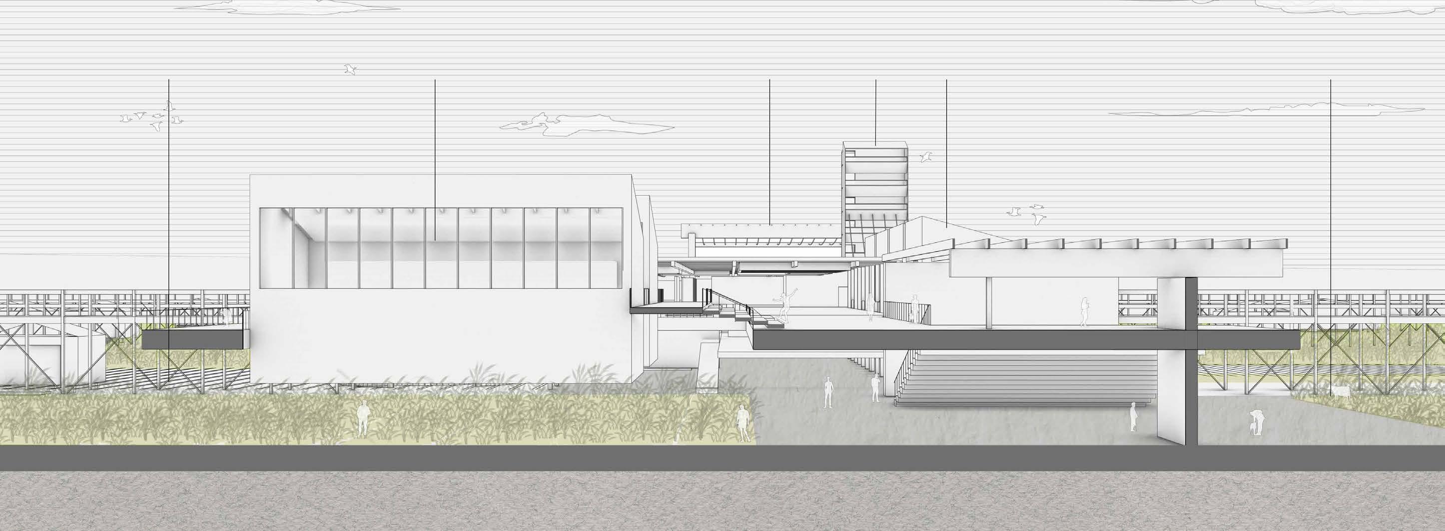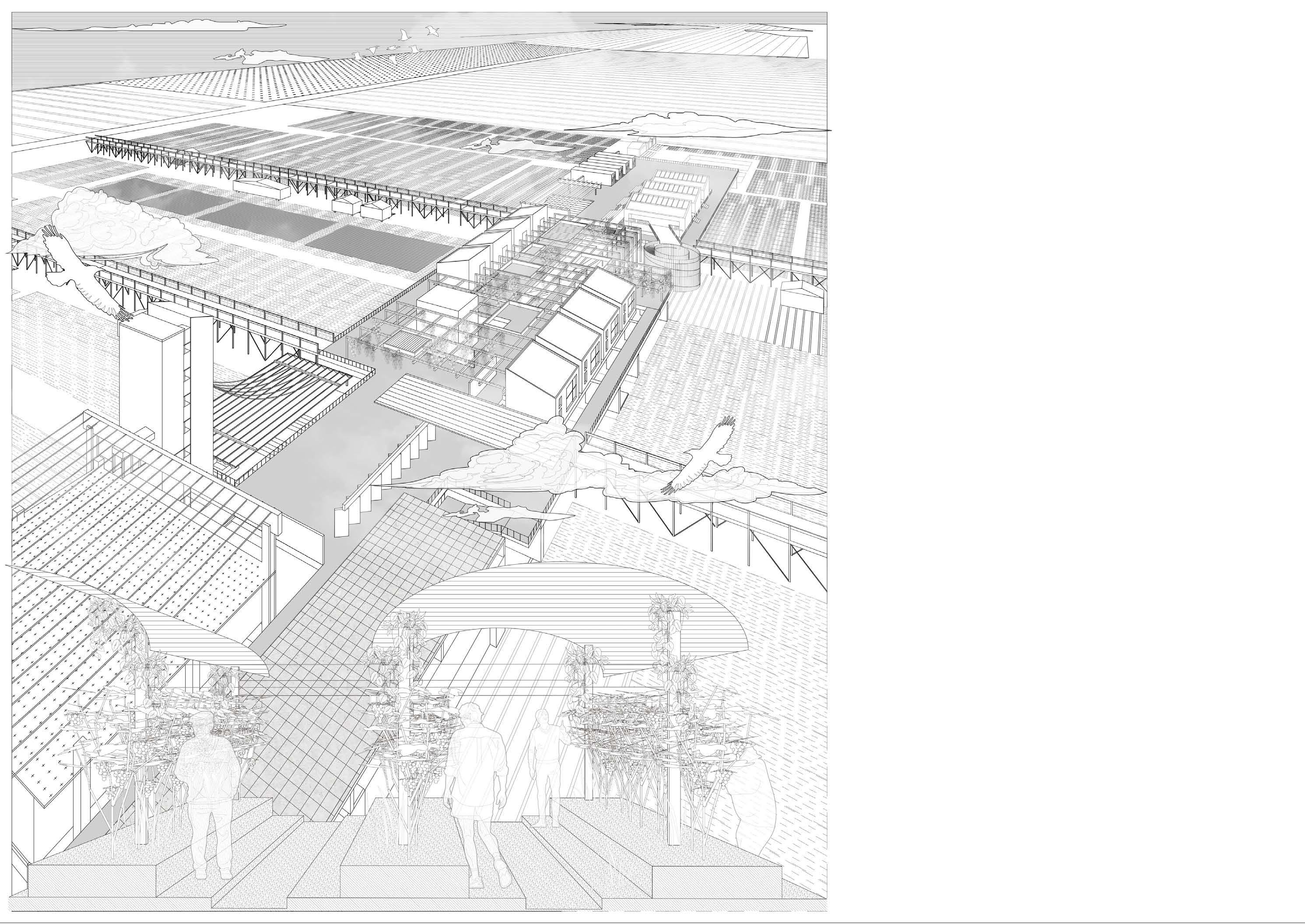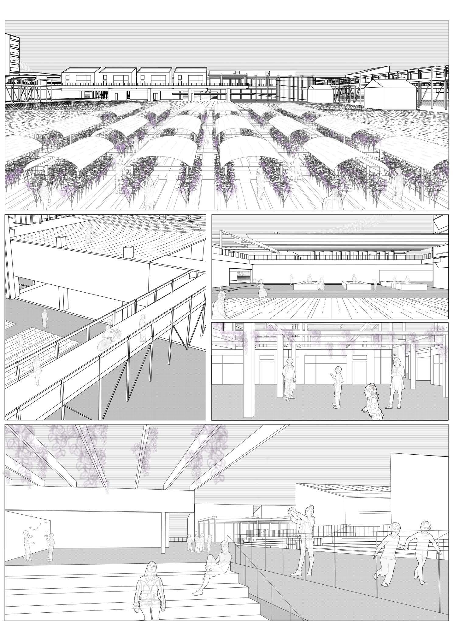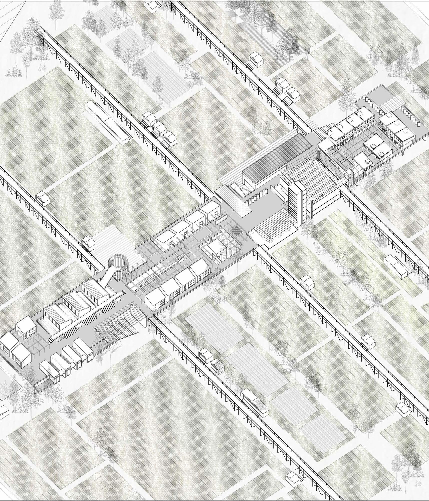 Using a lifting flat, and concentrating all the different functions of a village on it, like the residence, warehouses, market, school, and so on, it has a tendency to extend in all directions. To create a continuous farmland, I lift all the buildings to increase the land utilization, but in order to still have some of the village feel, Therefore, I chose to arrange the rural buildings with different functions on a long slab in the form of Mat building.