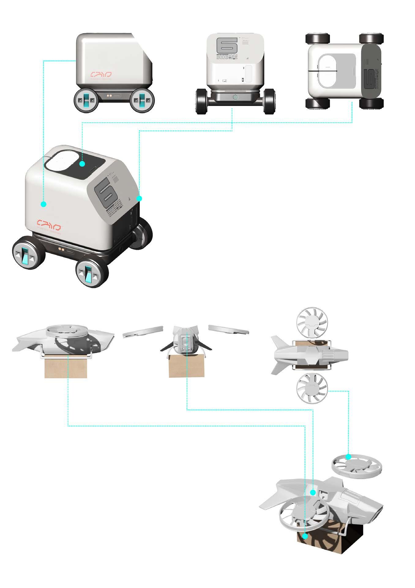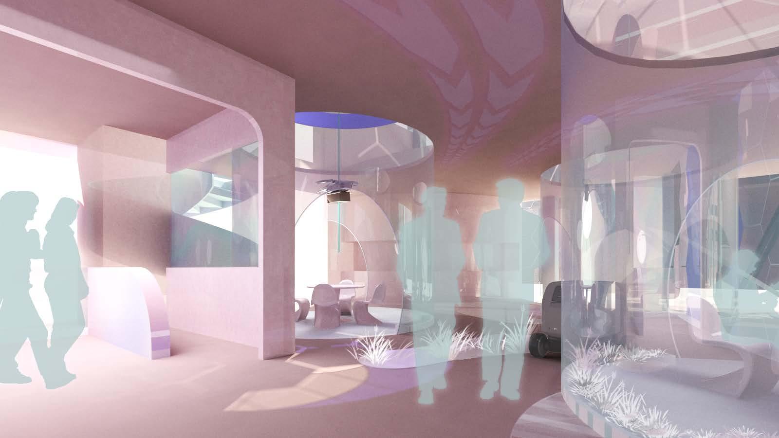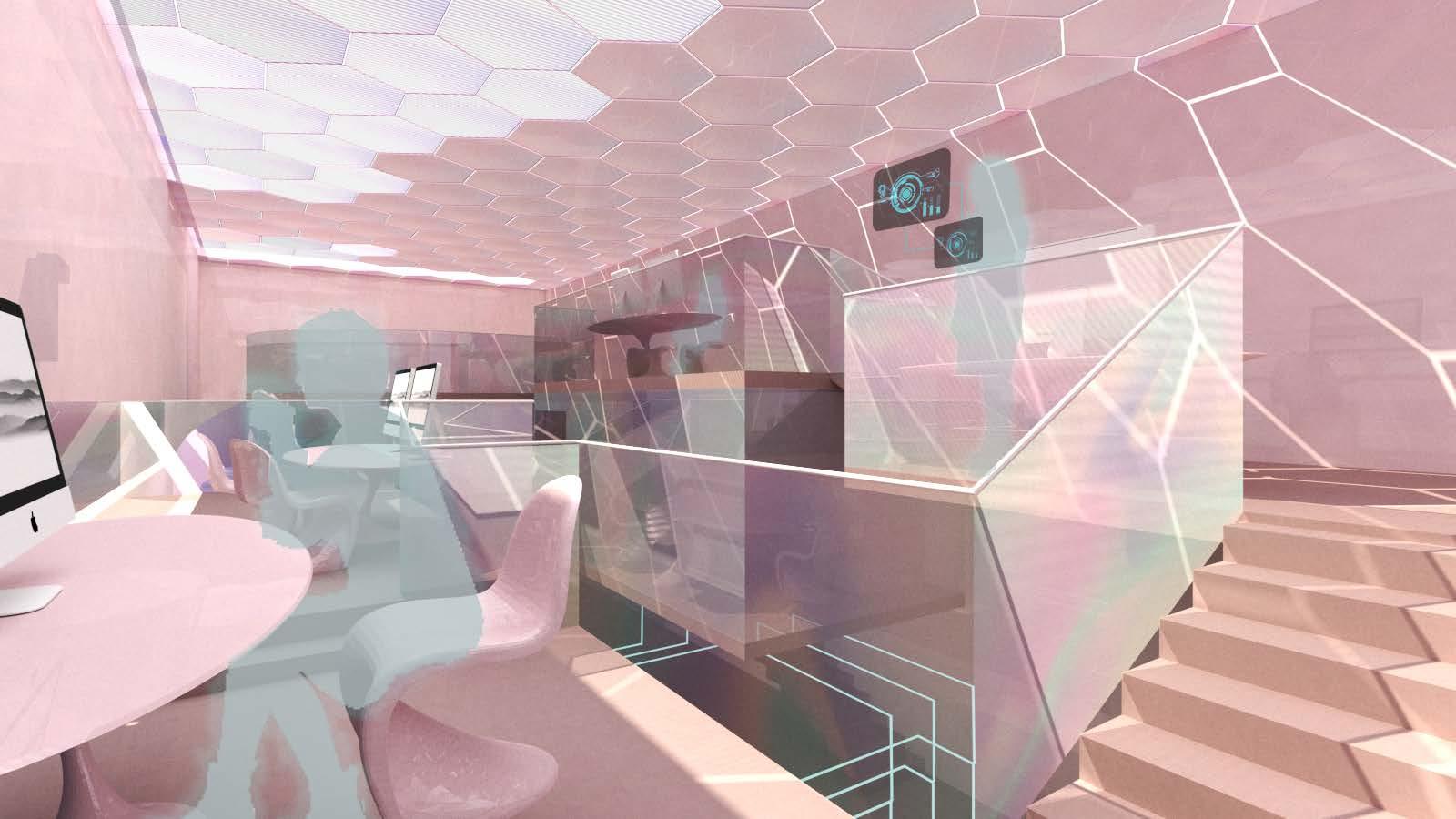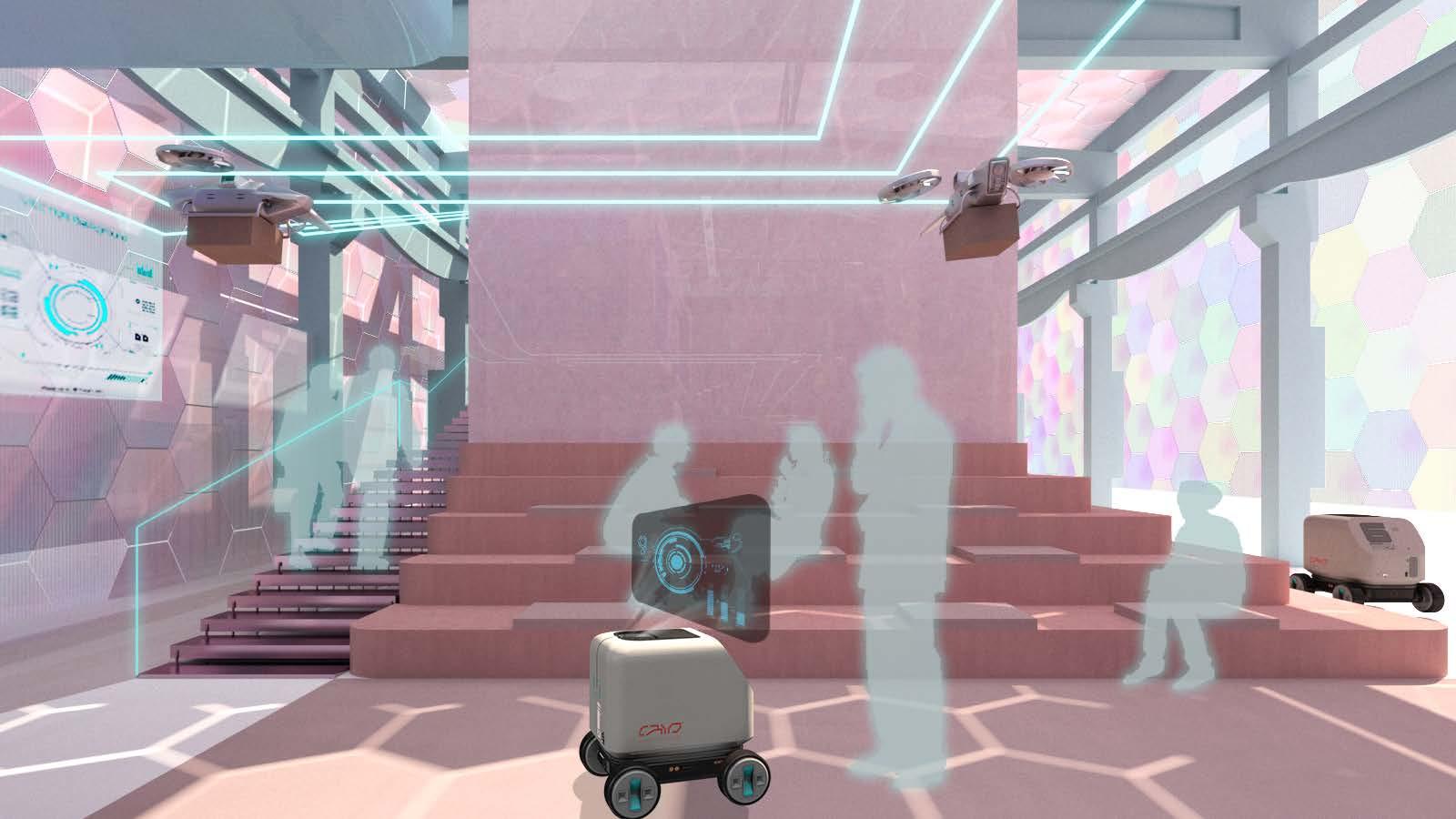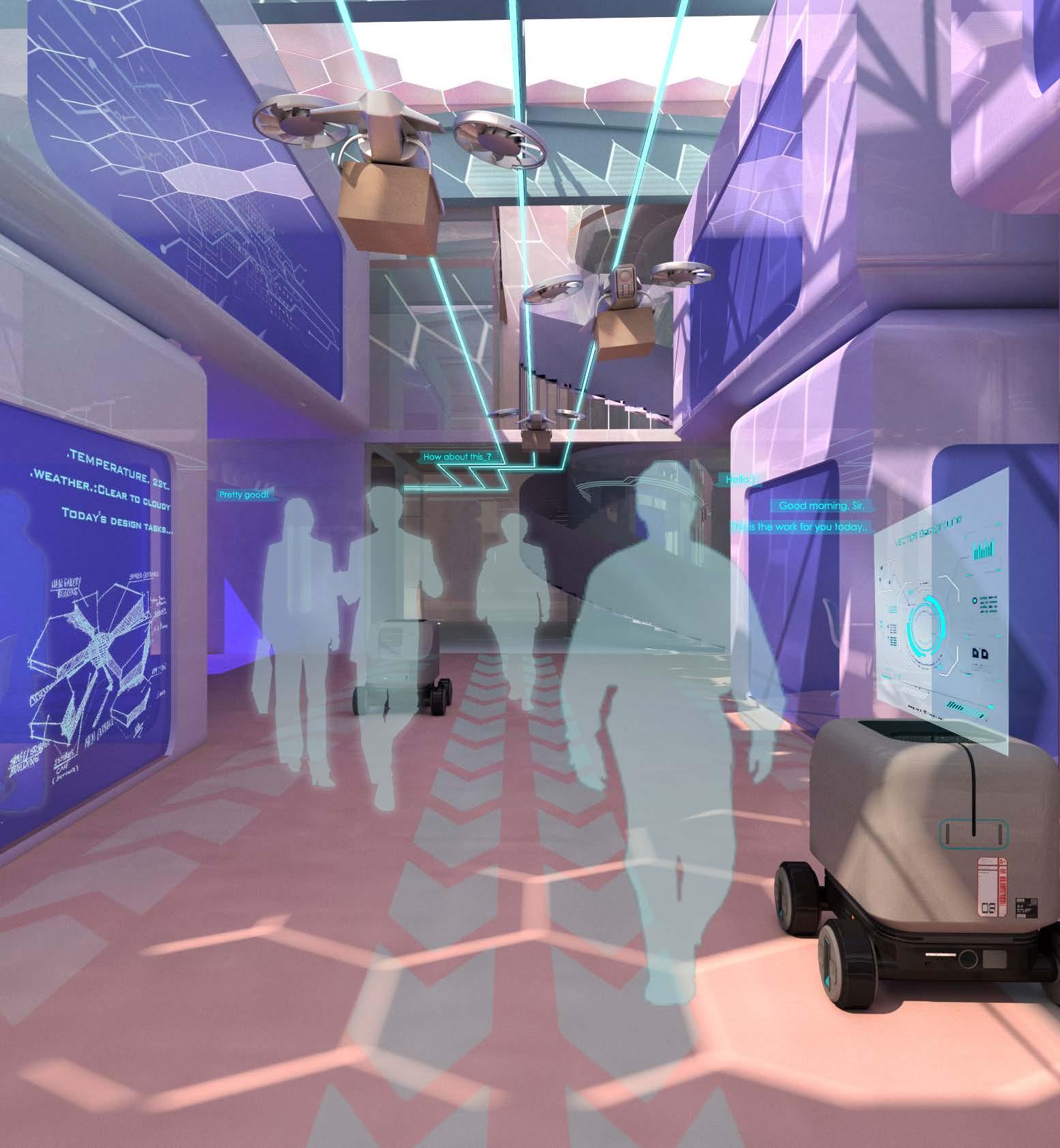 When we thinking about the future office or the future studio, I think it might should be a kind of co-existence of humans and robots, and there are some companies that already have done that now. Robots can help people do simple and repetitive tasks, can provide information for communication or can even do some sophisticated job. People and robots live and work harmoniously in the same space. The existence of robots greatly improves the efficiency and quality of people’s life. Therefore, in the design, I consider that there should be separate traffic flow of robots and their rest space, so as to achieve a harmonious coexistence of human and robot state.