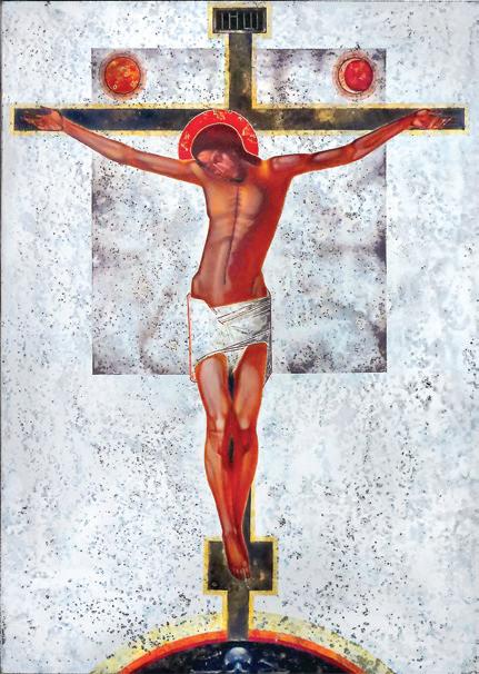 On the first floor is the Crucifixion by Ivanka Demchuk, a Ukrainian artist who specializes in colorful, classically designed iconographic presentations. The crucified Jesus is presented in warm red-orange, life-giving vibrancy, crushing death and evil at the foot of the cross. The textured background does not compete but supports the icon.
