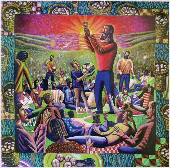 In our basement recreation room, artist James Janknegt gave us a brightly colored, evocative presentation of the Feeding the 5000, a scene that is repeatedly mentioned in the Gospels. Surely Mark 6:34–44 is the inspiration, with Jesus as a robust peasant and the crowd sitting on the grass in small groups. An abundance of bread and fish is vividly presented. How fitting for a room that brings us together for rejoicing!