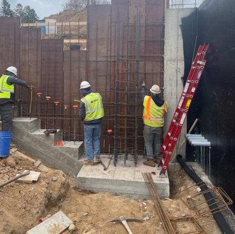 • The team is diligently installing horizontal, vertical, and transverse rebar for supplemental concrete strength.
