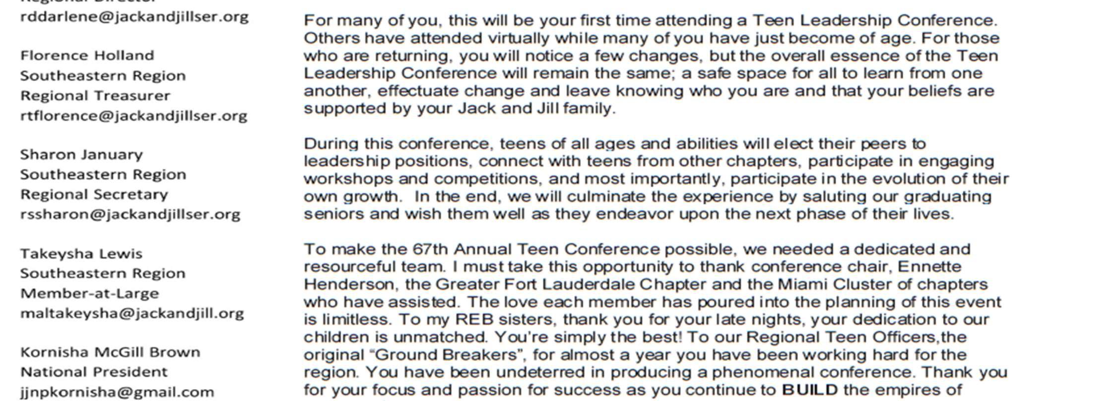 It is my great pleasure to welcome you to sunny South Florida and to the 67 th Southeastern Regional Teen Leadership Conference. I am honored to serve as this year’s Father’s Auxiliary Chair for the Greater Ft. Lauderdale Chapter. The POPs are ready to stand in support of our mothers and teens during this conference. I hope for a fruitful and wonderful experience during this conference and urge you all to take full advantage of the opportunities forwarded to you during your days here. Whatever you put into this experience is what you will get out of it, so please take the time to meet new teens and network with each other. I want to congratulate the graduating class of 2023. I wish you much success in your future endeavors and now that your Jack and Jill family is here for you. Thank you to the Regional Leadership Team and the Greater than Great Ft. Lauderdale Chapter for their efforts and commitment to ensure this year’s Teen Leadership Conference is a success. They have all gone to great lengths to make this a memorable conference and to keep with tradition. So again, take the time to network, be engaged, and enjoy this experience.