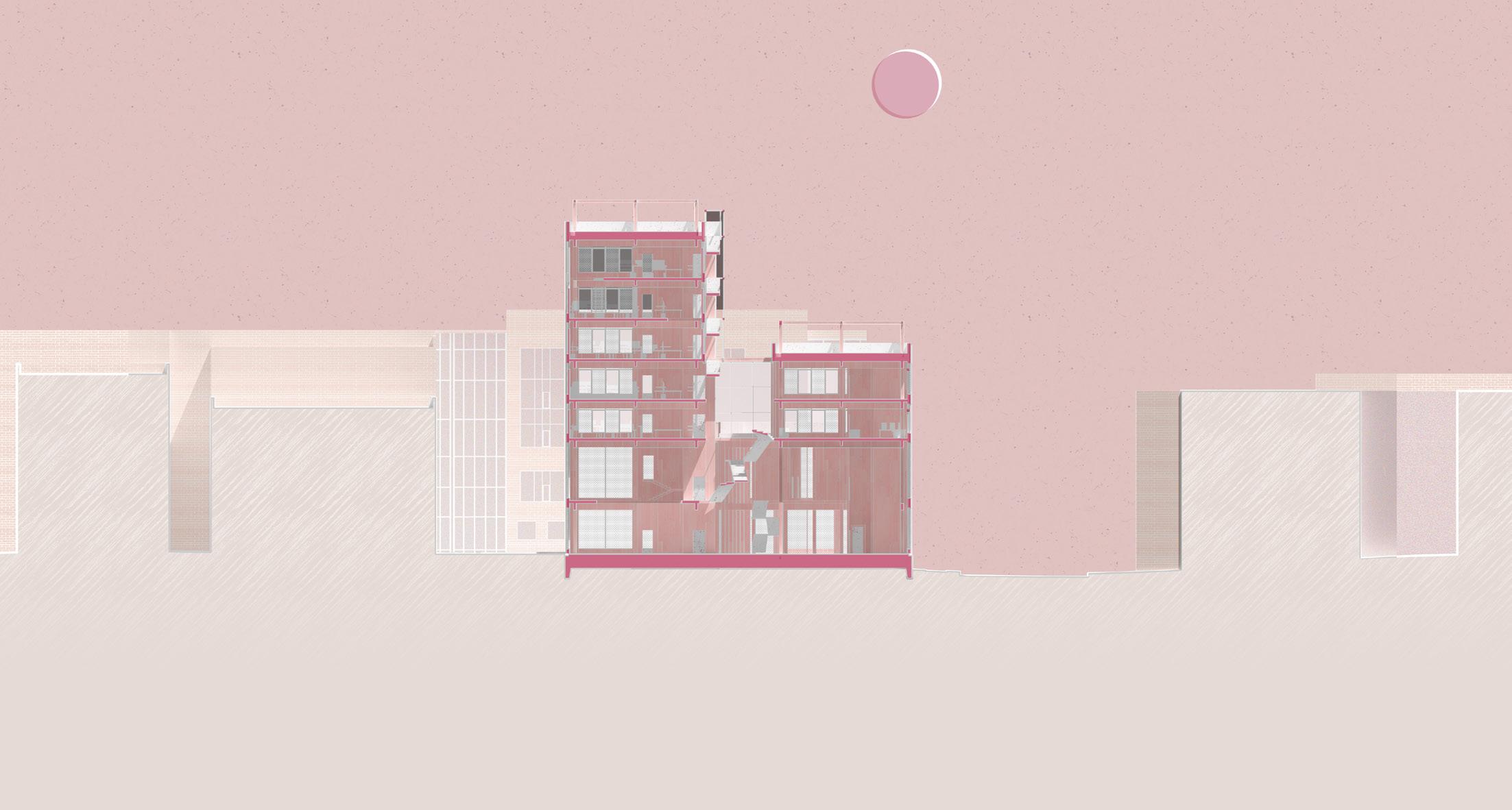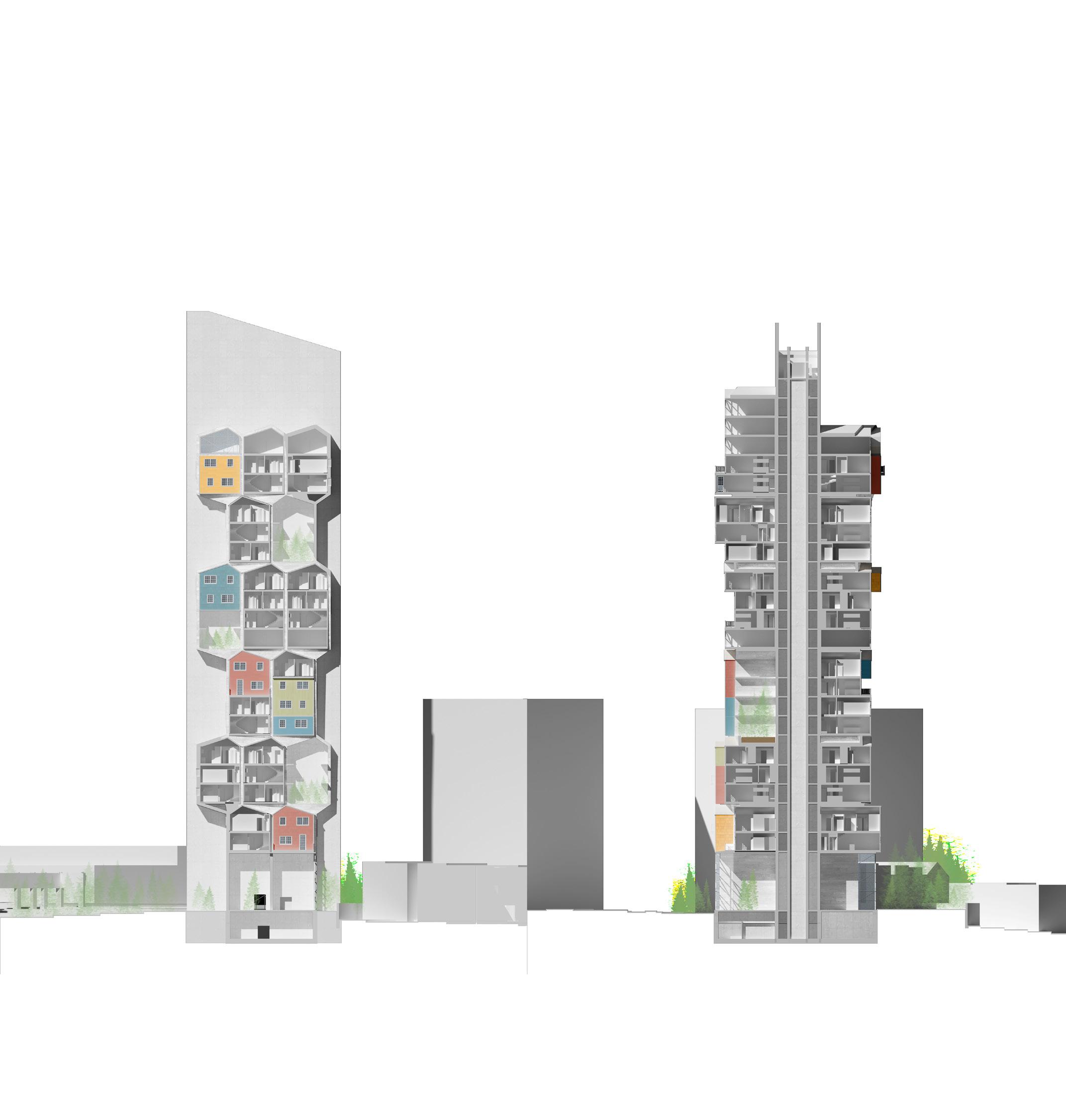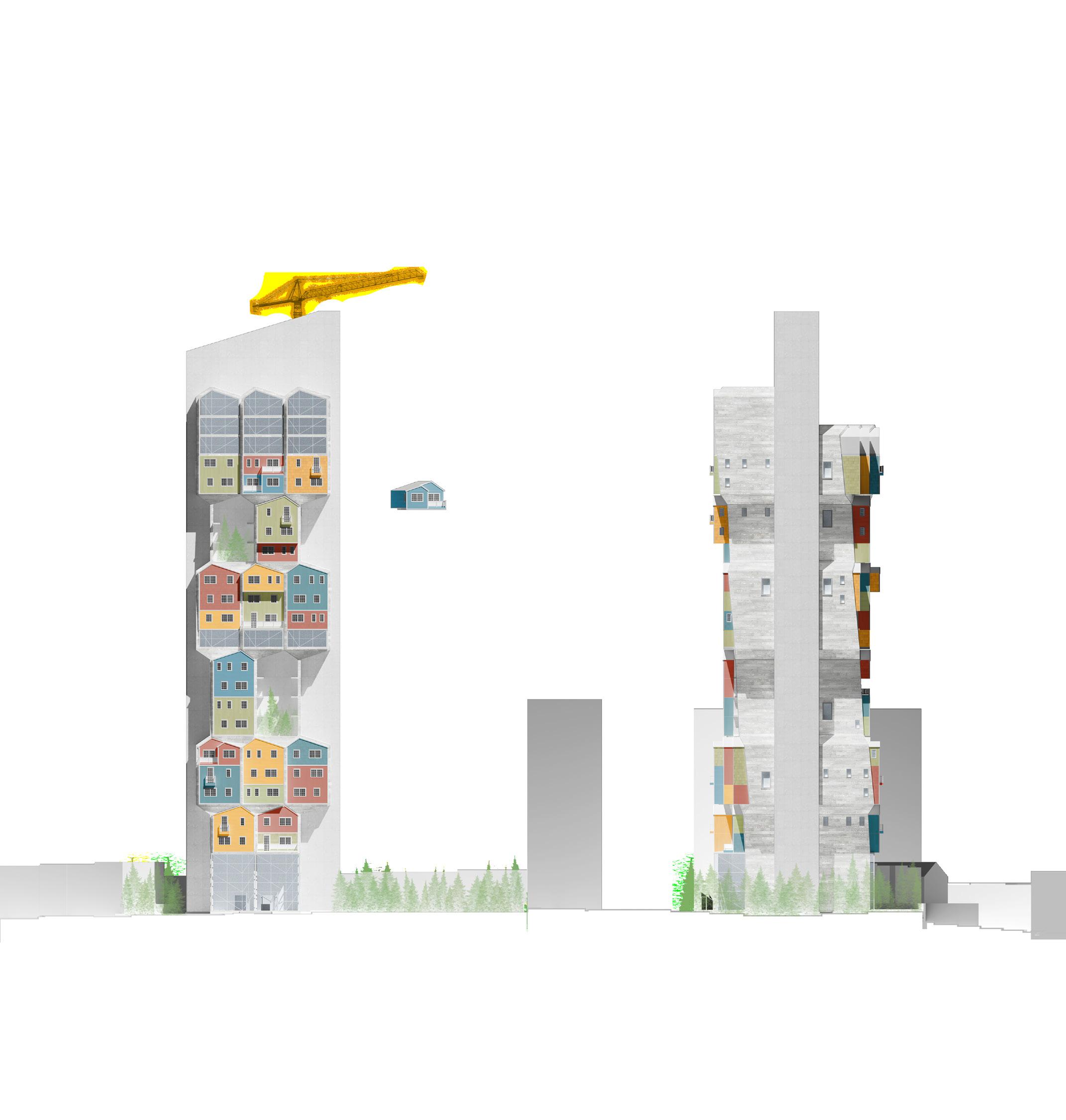 jägerdorf addresses the ever pressing housing crisis by taking the typical american suburban house and stacking it, flipping it, mirroring it to create a modular residential tower with individualized units. various private hydroponic gardens provide families dedicated spaces to grow their own food. it investigates ways of reusing old buildings to create new monuments. here, the facade of the historic yellow cab building acts as a gateway into a new urban forest, connecting newark residents with nature and recreating habitat for native species of wildlife. it fosters community through grand shared spaces: large entryways, green terraces, gym rooms. these spaces encourage inhabitants to occupy the same area and help each other grow and learn.