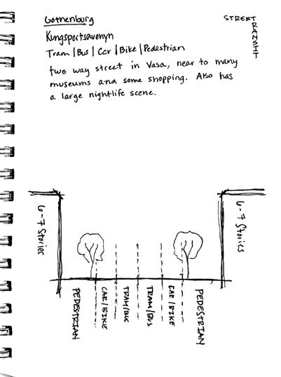 experiencing the street design in gothenburg made me reconsider how I design streets. in comparison to newark’s streets, there are a larger range of modes of transportation which overlapped each other. the combination of bus and tram lines makes sense upon experience. the combination of car lanes and tramlines works well in multiples locations throughout the city. the lack of prioritization given to cars allowed for better flow of transit overall. in the united states, especially newark, cars dominate transportation in terms of ridership and space allocation. but in gothenburg, not only were cars not a necesitty to move around the city, it appeared they would be less effective than public transit.