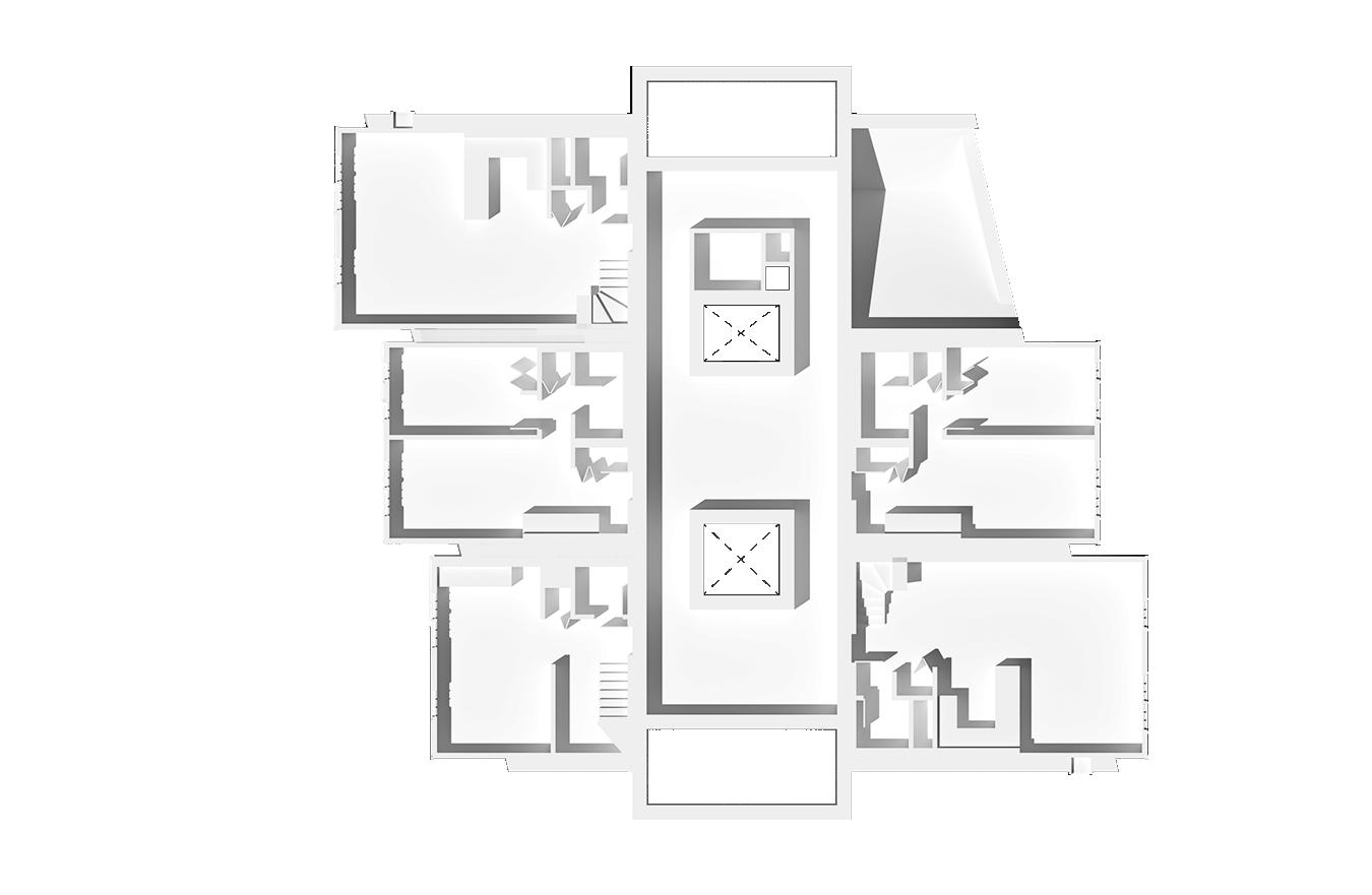 douglas hall accomplishes all of these ideals by lifting the studio spaces up and uniting them through a central atrium. this atrium exposes the structure of the building and create a network amongst the various design studios. each roof is accessible, offering views of njit, newark, and new york. the open courtyard provides relaxation and review areas, and connects to the weston green and gallery.