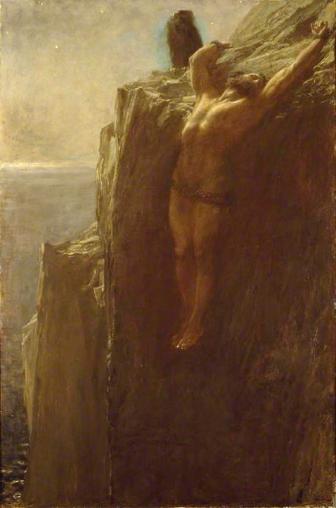 Prometheus (oil on canvas, 1889) by Briton Riviere: Riviere studied at St Mary Hall, Oxford, and with his father, a drawing master, and later became well known for his paintings of animals and subjects from mythology and history. In Greek mythology, Zeus banished Prometheus for several acts of defiance, by ordering him to be tied to Mount Caucasus, where every day an eagle devoured his liver, which was restored during the night. This depiction of the fall of night, and the coming of relief, was exhibited at the Grosvenor Gallery in 1889 with a quotation from Elizabeth