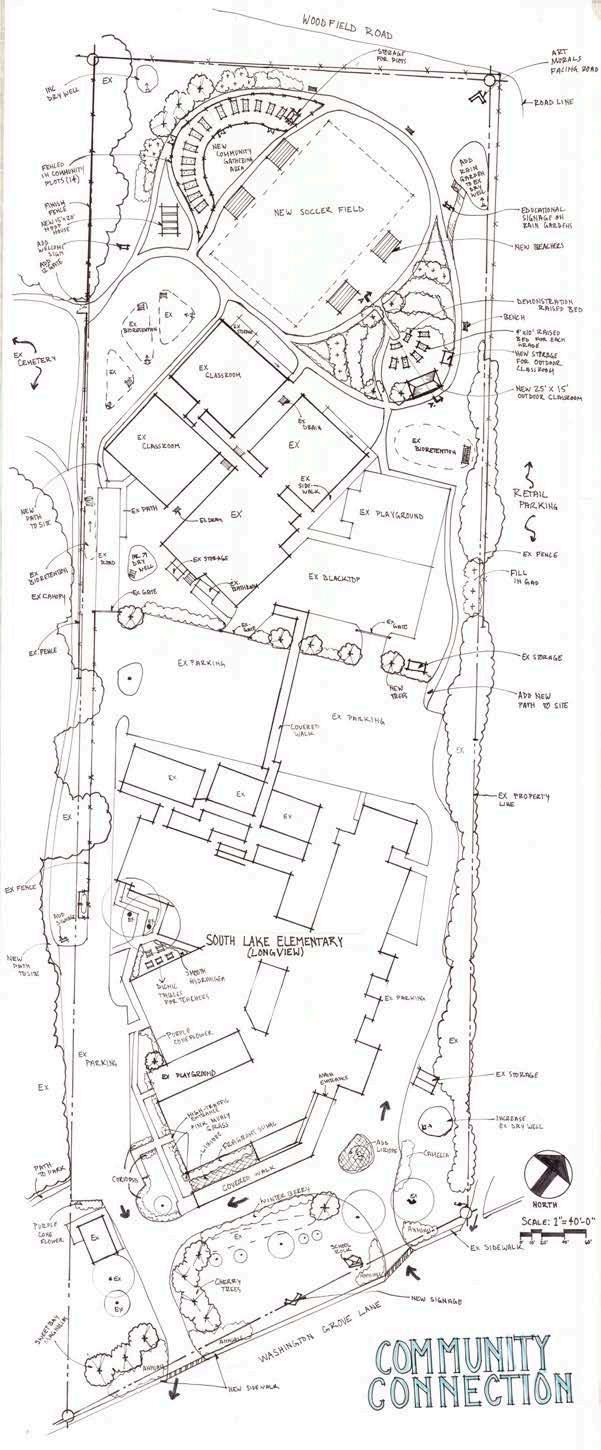 This project was based on community engagement with local community members in Washington Grove, right outside of Gaithersburg, MD. Southlake Elementary is currently a holding school, but it was historically a staple to community events. Community members wanted to reintroduce connection to this site through the existing park and cemetery located on the west side.