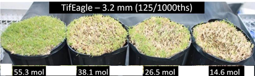 Bermudagrass needs 40 mol/m2/day for robust growth, while Poa Annua needs only 20 mol/m2/day for robust growth Image 1 shows varying DLI levels on TifEagle bermudagrass which is the type of grass we have on the greens