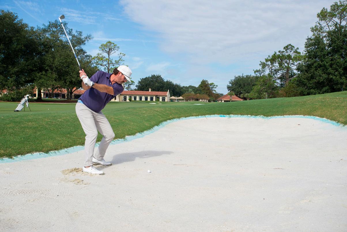 Hit balls in a straight line, creating a linear divot pattern (see video)