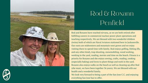 Rod and Roxann have reached nirvana, as we are both retired after fulfilling careers in commercial nuclear power plant operations and teaching, respectively. We are blessed with two wonderful children (twins) both of which are Naval Aviators stationed here in Jacksonville. Our roots are midwestern and mountain west grown, and we enjoy visiting there to spend time with family Rod enjoys golfing, fishing (fly and other kinds), trap shooting, snowmobiling, woodworking, working in the yard, reading, movies, and time on the beach. Fitness is a priority for Roxann, and she enjoys sewing, crafts, reading, cooking (especially baking), and gardening. Roxann also enjoys walks on the beach as well as cleaning up after Rod (she must, we have been together 36 years) We are blessed with our health and a wonderful family