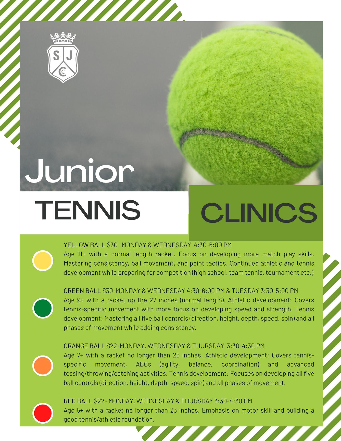 Learn to play tennis in a fun and positive environment. The after-school program is offered Monday-Thursday from 3:30pm-6:00pm depending on the level of play. Contact Dorian at dorian.porada@sjccjax.com for more information