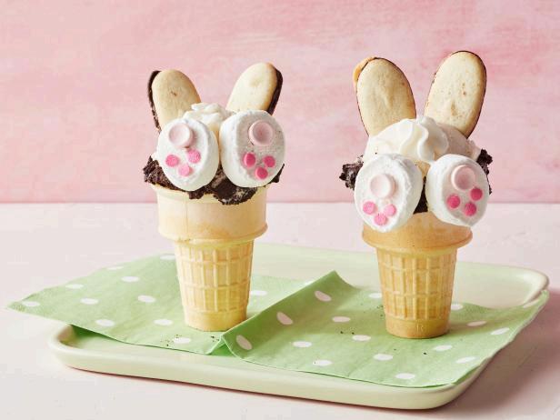 Pipe or top with a quarter-sized dollop of sweetened whipped cream between the feet for a bunny tail. Push 2 small oval shaped sandwich cookies (such as Mini Milanos) into the top of the ice cream scoop for bunny ears.