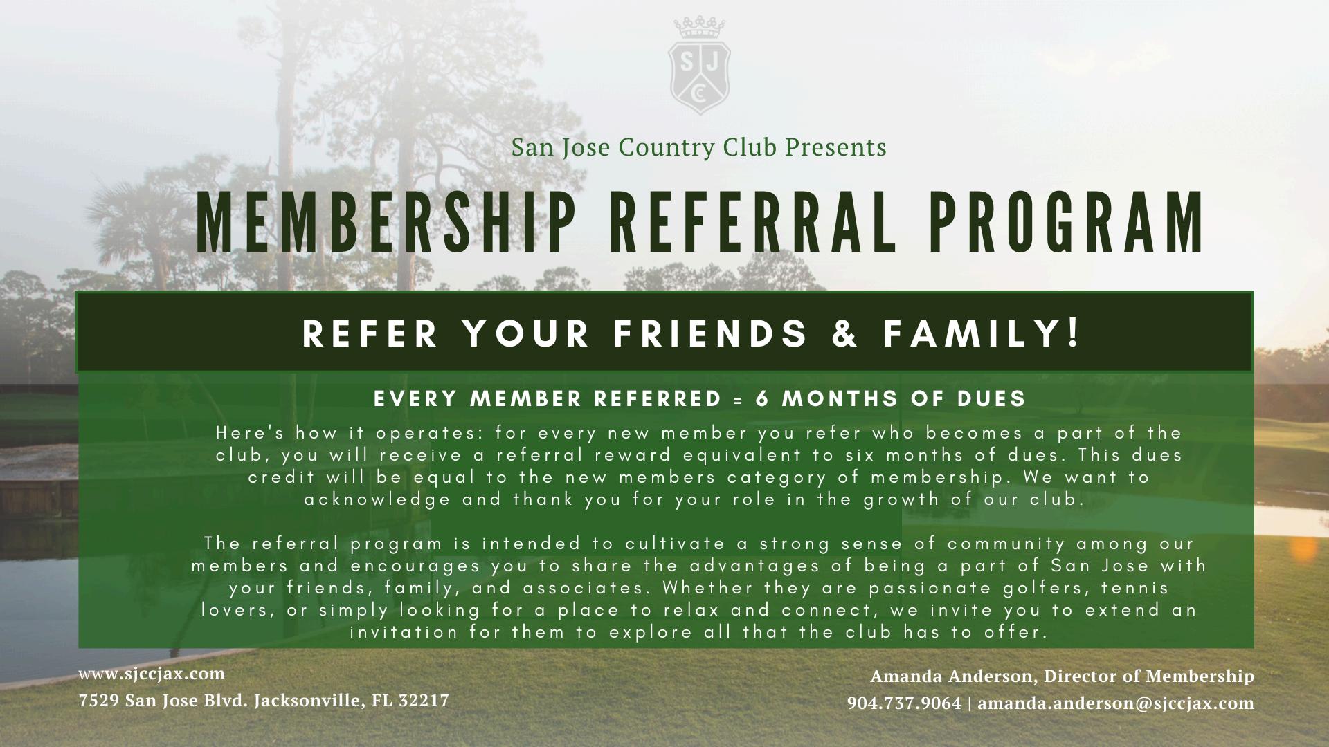 We are currently offering a new Member Referral Program. For each new member you refer who joins the Club, you will receive a six-month dues credit. This initiative not only rewards your efforts but also enriches our community by welcoming new members who will contribute to the vibrant atmosphere of the Club.