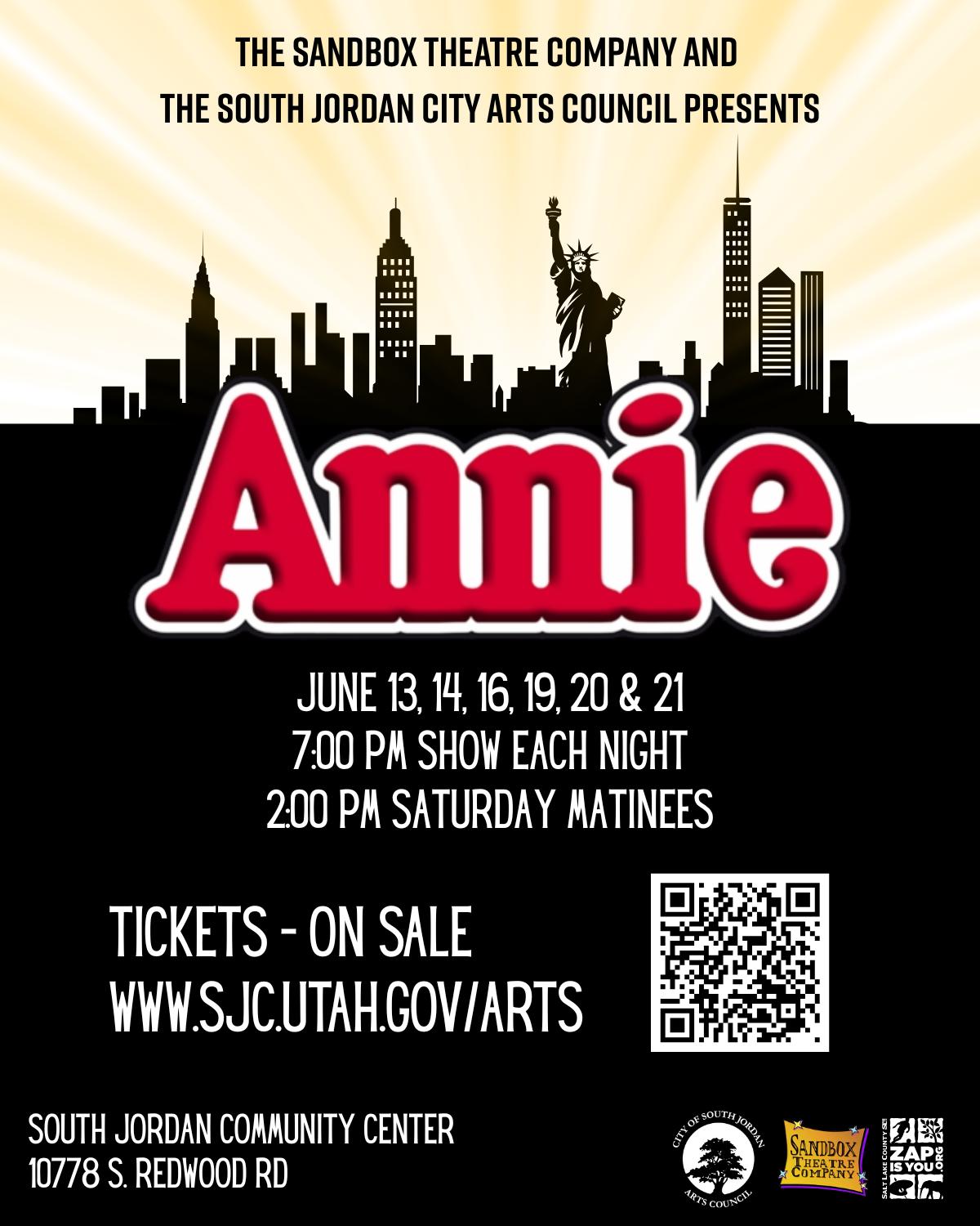 South Jordan Community Theater Summer Show 2025 “Annie” Show dates are June 13 – 21.