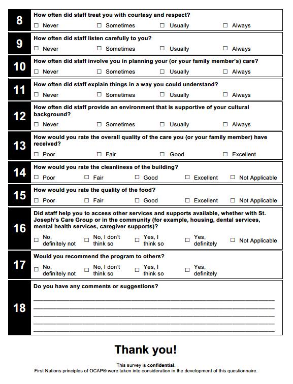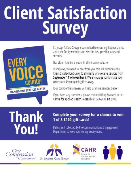 St. Joseph’s Care Group (SJCG) provides programs and services at seven different sites, including Balmoral Centre, Behavioural Sciences Centre, Hogarth Riverview Manor, St. Joseph’s Health Centre, St. Joseph’s Heritage, St. Joseph’s Hospital, and Sister Margaret Smith Centre SJCG’s broad service areas are Seniors’ Health; Addictions and Mental Health; and Rehabilitative Care. To measure client satisfaction across SJCG, a corporate-wide client satisfaction survey was developed in 2009 by the Client Satisfaction Survey Committee. The high-level snapshot captured by the survey permits comparison of satisfaction over time and across the broad range of services provided by SJCG. It also sets the stage for more in-depth measures of client and resident experience at the program level.