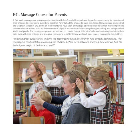 E4L Massage Course for Parents A five week massage course was open to parents with Pre-Prep children and was the perfect opportunity for parents and their children to enjoy some quiet time together. Parents had the chance to learn the Action Story massage strokes that are taught at school in E4L. Some of the benefits we have seen of massage at school include calmer, more empathetic children who are able to build up their reserves of physical and emotional well-being through touching and being touched kindly and gently. The course gave parents some ideas on how to bring a little bit of calm and nurturing touch into their daily lives with their children and also gave them some insight into how we teach peer to peer massage to the children.