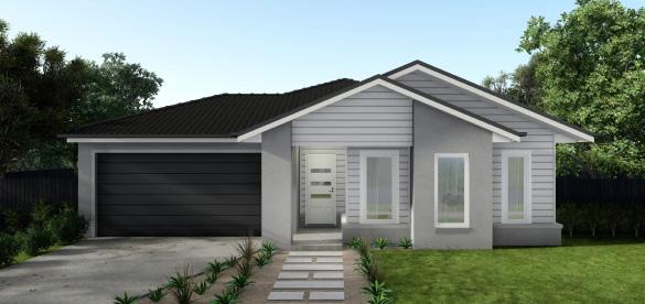 Features: No raised porch, 2 rendered brickwork piers with 2 135x135mm LOSP painted posts each, render to entry and garage, eaves to entire facade, 2 Armadale awning windows (width/number of windows dependent on house width and design), Scyon Linea weatherboard cladding to front with rendered brickwork below, excluding entry and garage, Gable ends with Scyon Linea weatherboard infill