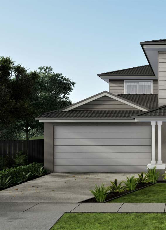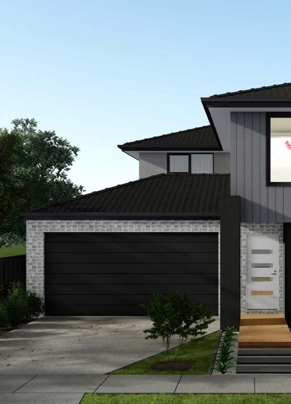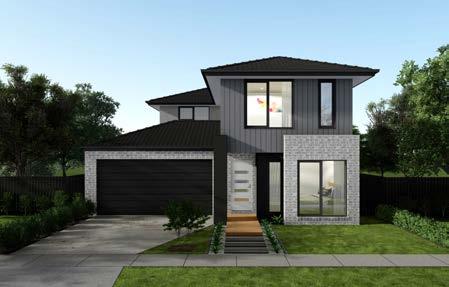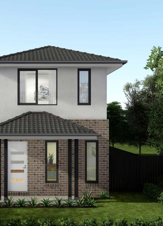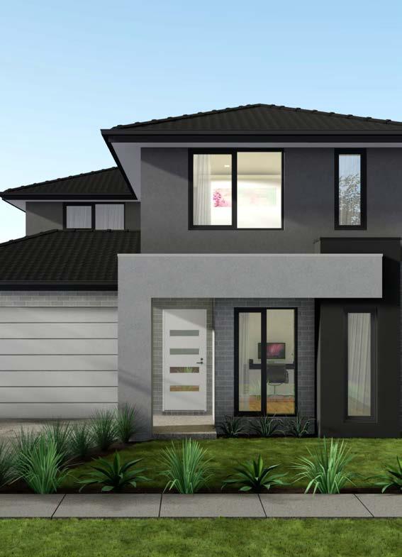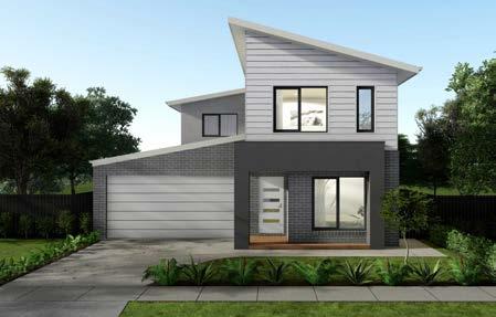 Features: Rendered 1310 x 590 brick pier and 350 x 1070 engaged pier, Rendered brickwork above porch/between piers, Scyon Linea cladding (weatherboards) to first floor wall of facade. Rendered foam to remainder of first floor, Rendered foam projection to first floor, Skillion roofs over house and garage, 2057H Armadale awning windows to ground floor and 1800H to first floor (width/number of windows dependent on house width and design)