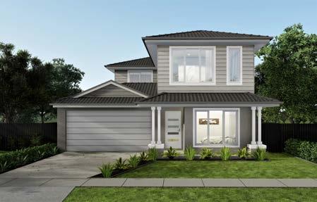 Features: Scyon Linea cladding (weatherboard) to first floor façade walls, rendered foam to remainder of first floor, 2/590 x 710 rendered piers with 2/painted posts above each pier and flat profile moldings, Render to entire ground floor of facade, Eaves to entire facade, 1800H Armadale awning windows (width/number of windows dependent on house width and design), Flat profile moldings to posts and window surrounds, Dutch gable with Scyon linea cladding (weatherboard) to top of garage roof