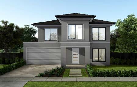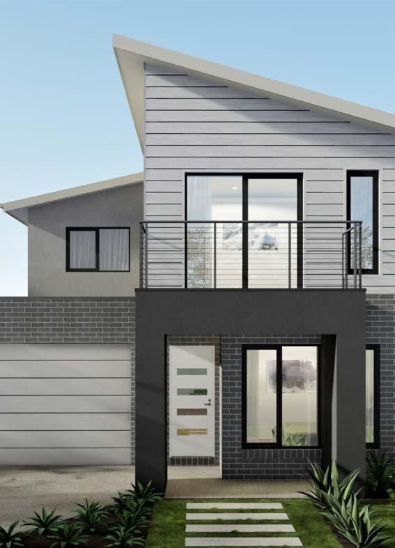 Features: Rendered 470 x 470 brick piers, Rendered brickwork above porch/between piers, Scyon Linea cladding (weatherboards) to first floor projection. Rendered foam to remainder of first floor, Skillion roofs over house, Parapet to front of garage, 1800H Armadale awning windows to façade (width/number of windows dependent on house width and design), Stainless steel and tension wire balustrade to balcony, Sliding door to balcony