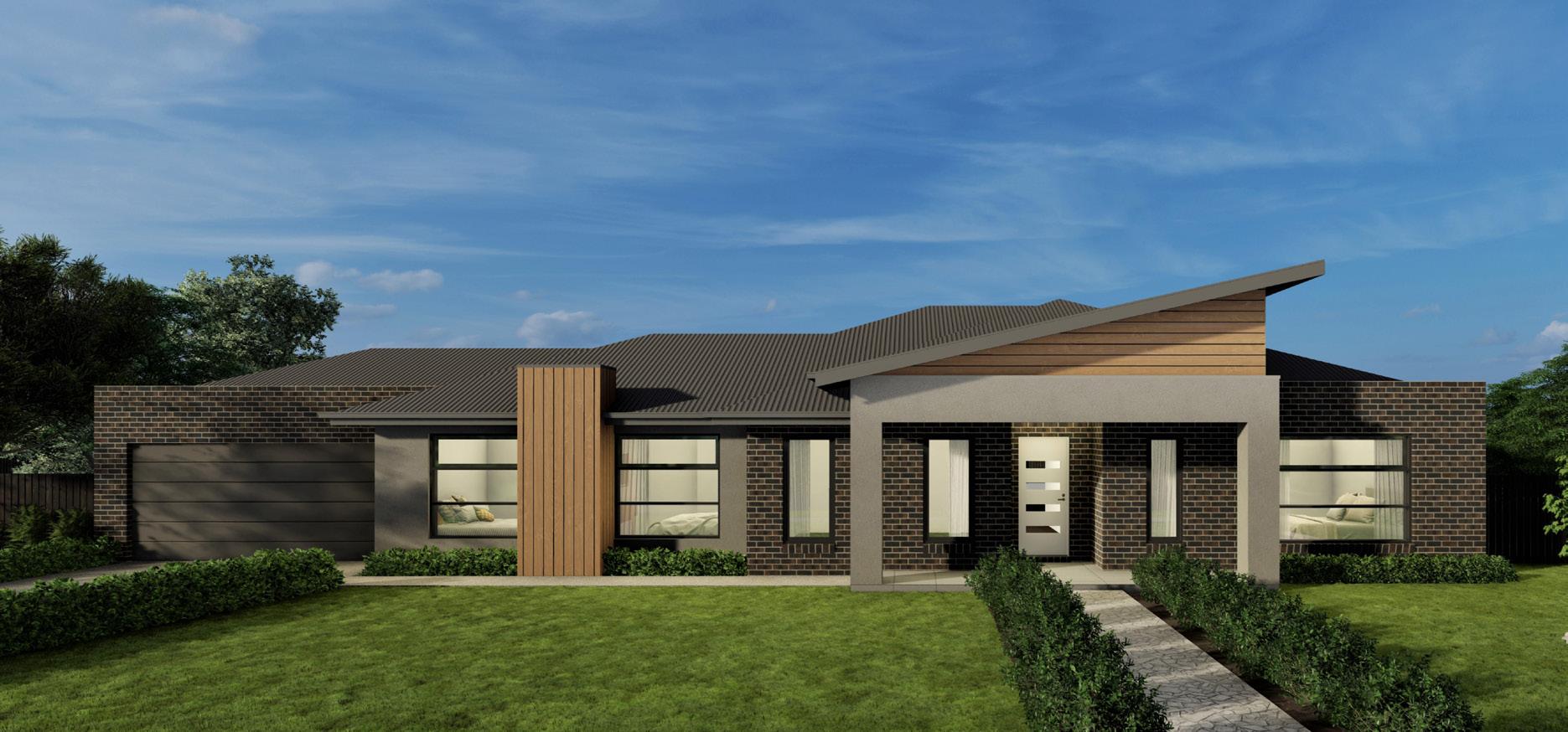 Features: Raised porch with skillion roof, eaves to the facade (excluding garage and external corner of the home), parapet to the garage and external corner of the home, feature projection with V-joined Tasmanian Oak cladding (installed vertically), rendered brick piers to the porch, rendered brickwork between piers with V-jointed Tasmanian Oak cladding above (installed horizontally), and Multi-Transom and Armadale awning windows to the facade.