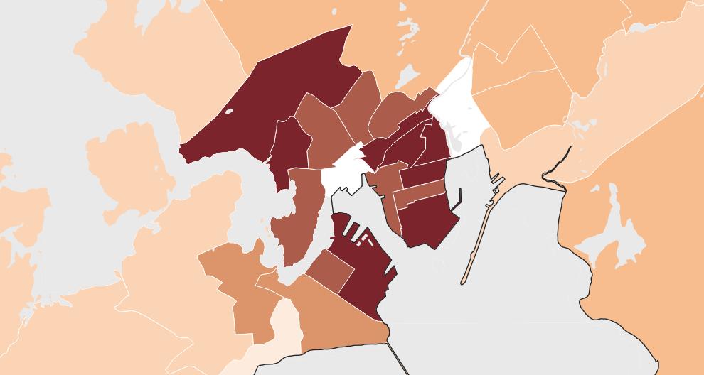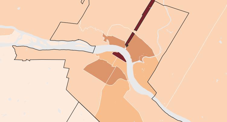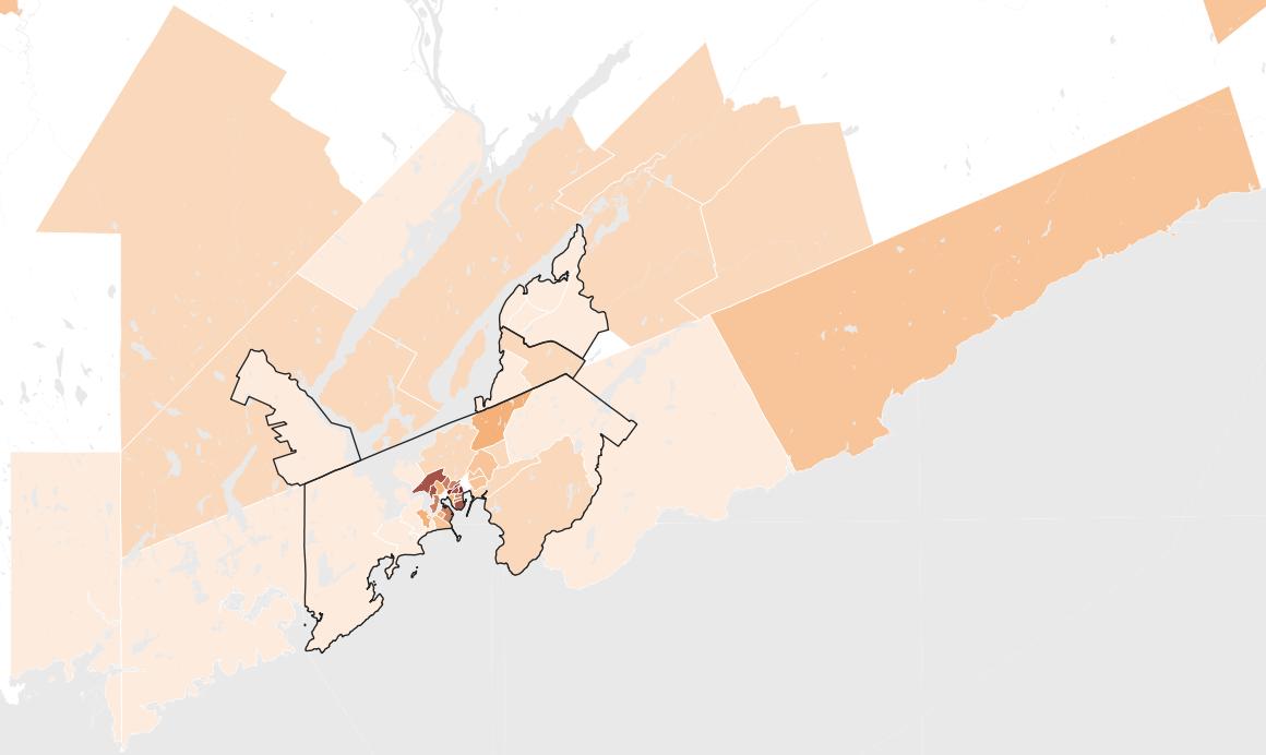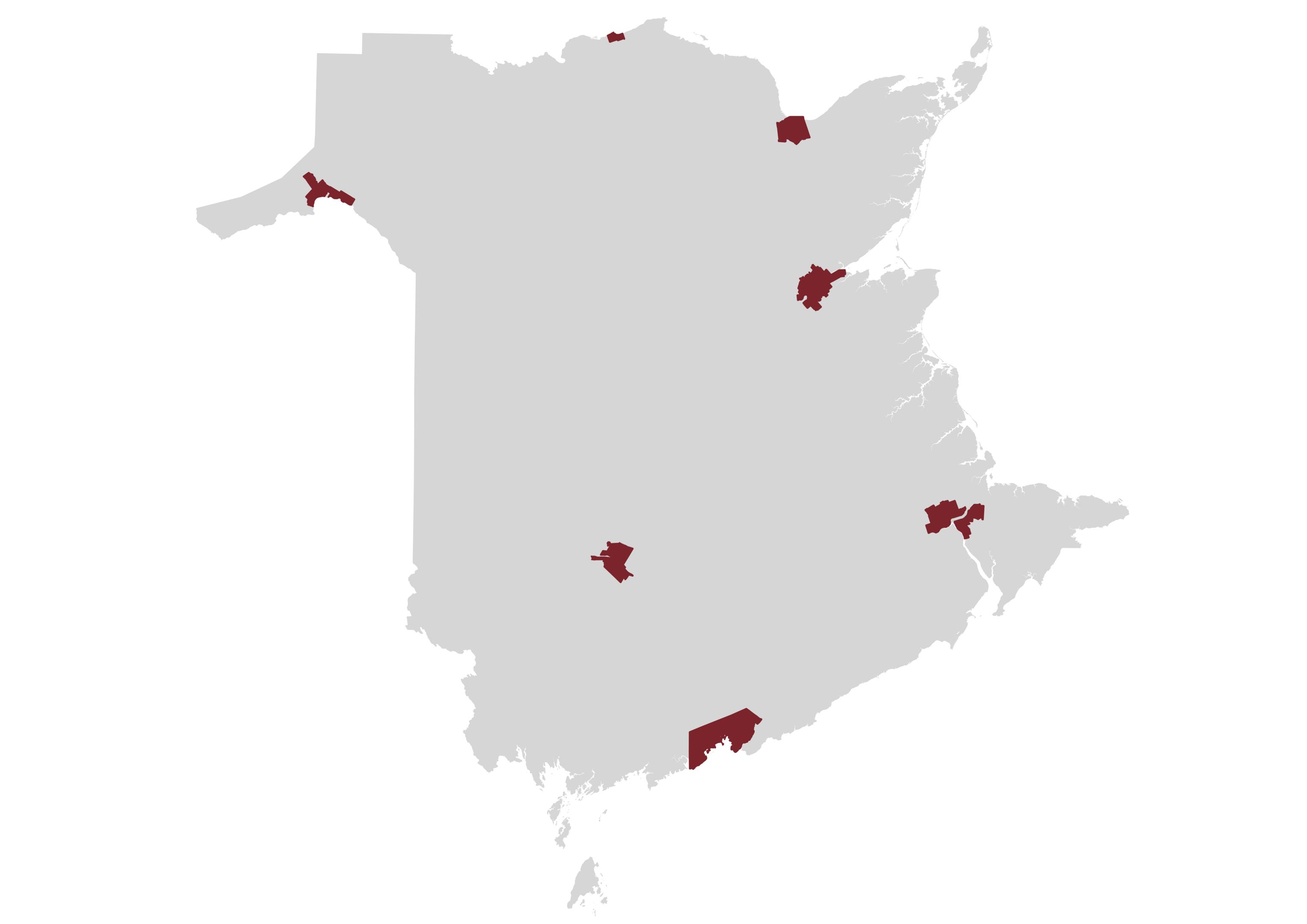 Les taux de pauvreté infantile (MFRFR - ApI) au Nouveau-Brunswick sont inégalement répartis dans ses huit villes, allant de plus de 30 % à Campbellton, Saint John et Bathurst, à un minimum de 15 % à Dieppe.