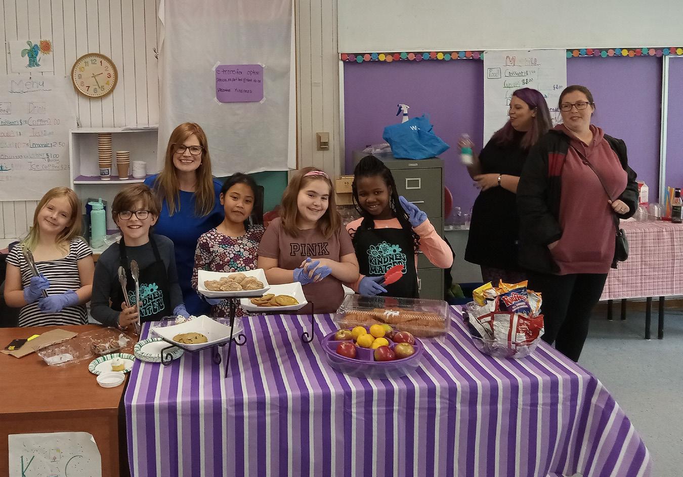 Camp participants at the Forest Glenn Community Centre donating to the East Side Food Bank the money they raised through their Bake Sale