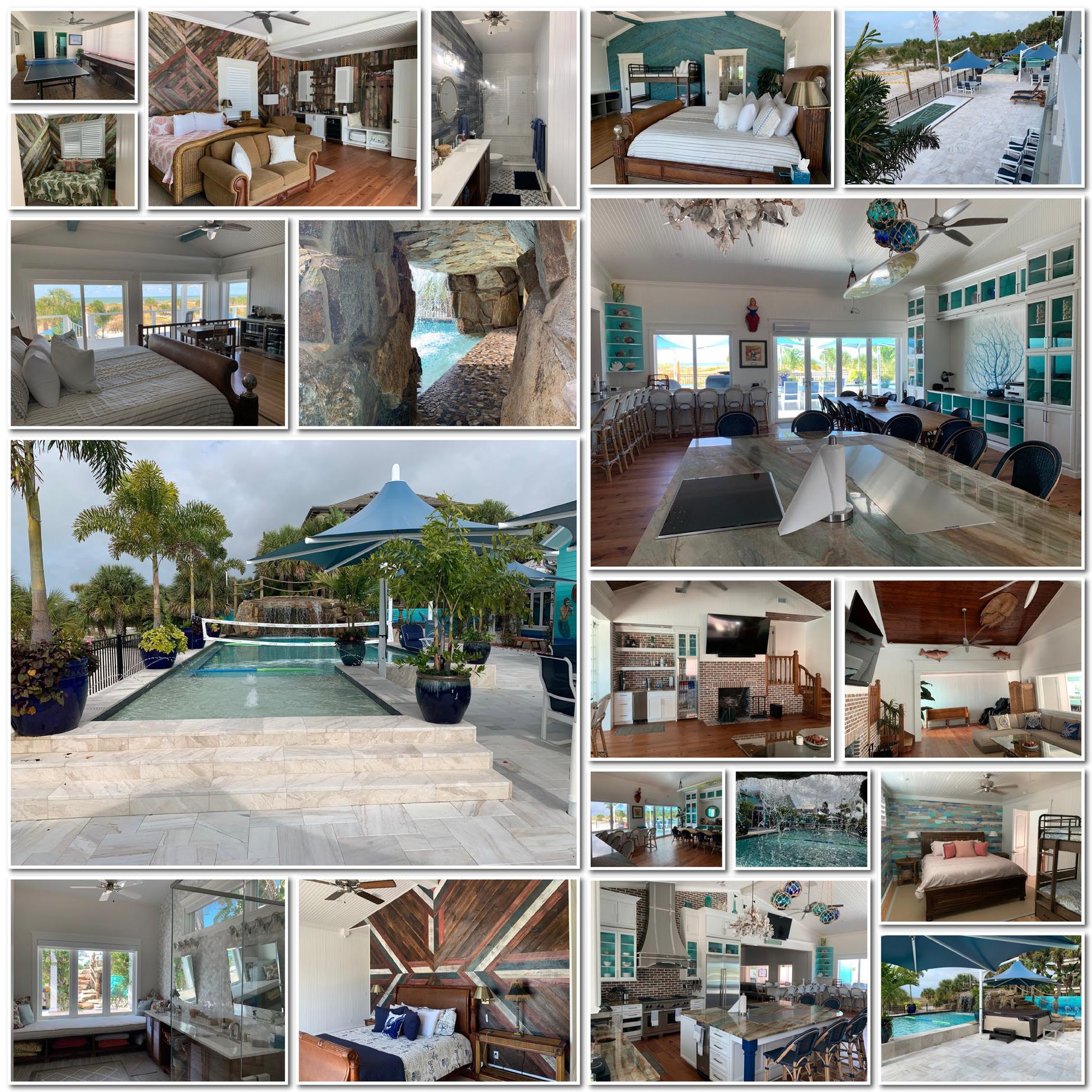 The beachfront residence is nothing short of spectacular. With five (5) king suites, two (2) master retreats, and an additional bunk accommodations, there’s room for everyone to relax in comfort. A chef-worthy gourmet kitchen anchors the home, inviting connection and celebration, while the expansive outdoor living space becomes the heart of your stay. Lounge by the resortstyle pool with its sun shelf, grotto waterfall, and jacuzzi, or enjoy endless entertainment with a private game room, beach volleyball, kayaks, fishing gear, and more. Every detail is designed to elevate your time together.