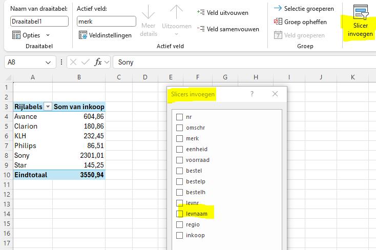 Om de gegevens ook te kunnen selecteren per leverancier, voeg je een slicer toe.