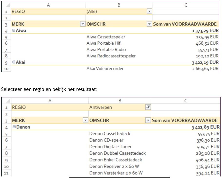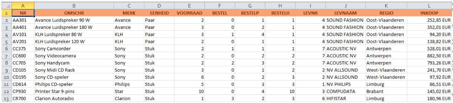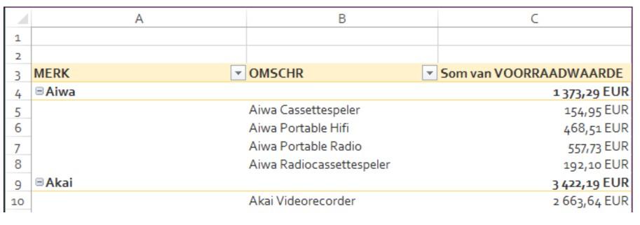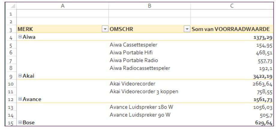 Je krijgt een lijst met producten. Deze lijst bevat onder meer de huidige voorraad en de inkoop- en verkoopprijs. We willen graag een duidelijk overzicht krijgen van de voorraadwaarde per merk. Hiervoor herschikken we de gegevens en maken we een draaitabel. Dit doen we als volgt: ( video )