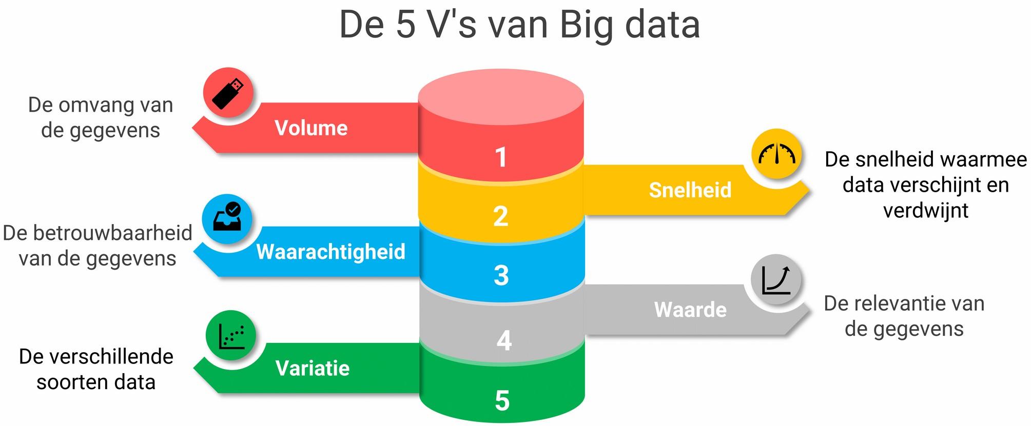 Big data is een term die gebruikt wordt om te verwijzen naar de enorme hoeveelheid en verscheidenheid van gegevens die in de digitale wereld worden geproduceerd, verzameld en geanalyseerd. Big data kan afkomstig zijn uit verschillende bronnen, zoals sociale media, websites, sensoren, camera's, smartphones, enz. Big data kan waardevolle inzichten opleveren voor verschillende doeleinden, zoals marketing, wetenschap, gezondheid, onderwijs, enz.