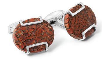 Crafted from rare red fossilised dinosaur bone discovered in the ancient beds of Utah, each stone is naturally unique in pattern and shape. Set in a polished rhodium-plated sterling silver casing to highlight the stone’s rich texture and deep crimson hues, they have been limited to only four pairs in existence for a true collector’s piece.