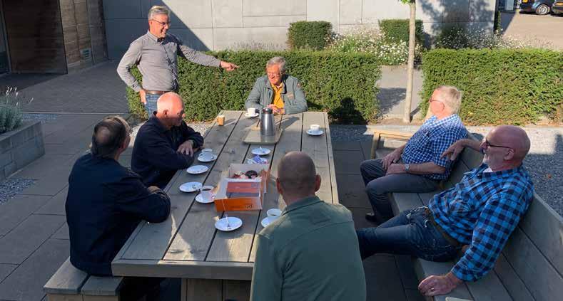 Bij Zegers Bouw blijven veel medewerkers lang aan het bedrijf verbonden. Zelfs tot na hun pensioen. Zo bestaat de maandagmorgenploeg - die nog steeds de tuin van het Edese kantoor verzorgt - louter uit oud-Zegers medewerkers. Iedere maandag wordt er geklust en herinneringen opgehaald. Reden genoeg om een keer tijdens de koffiepauze aan te schuiven. We nemen voor de gelegenheid plaats aan een grote houten tafel. “Door ons zelf gemaakt”, zegt Jan van Beek. “Net als de stoelen. Mooi hè?” Jan zit met zijn collega’s op de praatstoel. Maarten Heus, Barend Wagtho en Berend Jan van Veldhuisen zijn net als Jan met pensioen. Wat inderdaad opvalt, is dat al deze mannen een lange carrière achter de rug hebben bij Zegers Bouw, variërend van