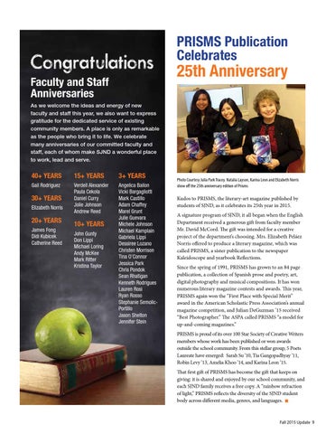 Kudos to PRISMS, the literary-art magazine published by students of SJND, as it celebrates its 25th year in 2015. A signature program of SJND, it all began when the English Department received a generous gift from faculty member Mr. David McCord. The gift was intended for a creative project of the department’s choosing. Mrs. Elizabeth Peláez Norris offered to produce a literary magazine, which was called PRISMS, a sister publication to the newspaper Kaleidoscope and yearbook Reflections. Since the spring of 1991, PRISMS has grown to an 84 page publication, a collection of Spanish prose and poetry, art, digital photography and musical compositions. It has won numerous literary magazine contests and awards. This year, PRISMS again won the “First Place with Special Merit” award in the American Scholastic Press Association’s annual magazine competition, and Julian DeGuzman ’15 received “Best Photographer.” The ASPA called PRISMS “a model for up-and-coming magazines.” PRISMS is proud of its over 100 Star Society of Creative Writers members whose work has been published or won awards outside the school community. From this stellar group, 5 Poets Laureate have emerged: Sarah Su ’10, Tia Gangopadhyay ’11, Robin Levy ’13, Amelia Khoo ’14, and Karina Leon ’15. That first gift of PRISMS has become the gift that keeps on giving: it is shared and enjoyed by our school community, and each SJND family receives a free copy. A “rainbow refraction of light,” PRISMS reflects the diversity of the SJND student body across different media, genres, and languages. n