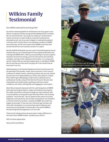 Wilkins Family Testimonial Dear SJNMA Leadership/Faculty/Clergy/Staff: Our family is beyond grateful for all that each one of you gave in your efforts to welcome families during Families Weekend back in October. We not only felt like the “red carpet was rolled out” but also felt an instant connection to staff, students, and other families by the atmosphere each one of you were integral in creating that weekend. In the two short months that our son had been a student at SJNMA this school year, we felt more a part of the SJNMA community than we ever did with our son’s previous school in 2.5 years! We left Delafield feeling like we were a part of something special and so thankful that our son is benefiting from the exceptional education and training that SJNMA offers. What you are providing is not just a superior education but also the training-up of men and women who will leave as leaders, serving in their respective communities. It is a unique and worthy mission that you have each signed up for in working for SJNMA. We can say that your hard work truly pays off in the results that we have seen in our son.