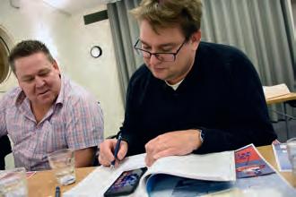 Svåra räkneuppgifter Gruppen diskuterar hur ersättningen för befälhavarens första sjukår blir. Jyri Lämsä påpekar att man går över till Försäkringskassan efter 5 månader. Håkan Nilsson tittar i PTK:s ”Handbok om för säkringar 2017” och läser att han får 77,6 procent från Försäkringskassan. Diskussionen om hur stor ersättningen blir visar att det inte är helt enkelt, ingen vet exakt och Håkan Nilsson bläddrar i PTK:s handbok där han hittar ett sätt att räkna.
