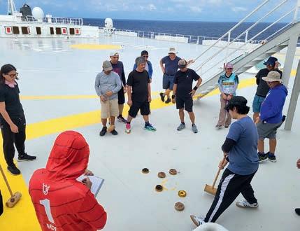 NABUCCOS BEFÄLHAVARE Per Lundholm skickade oss en hälsning från södra Atlanten, där andrestyrman Icy Balunan arrangerade tävlingar för att umgås på fritiden under den 37 dagar långa sjöresan från Lianyungang i Kina till Tarragona i Spanien, via Godahoppsudden i Sydafrika. Det blev till exempel en lång dartturnering under resan och också, mer koncentrerat till en helg i juli med fint väder, pingisturnering, basketmatch och däcksgolf, som bilden visar. n