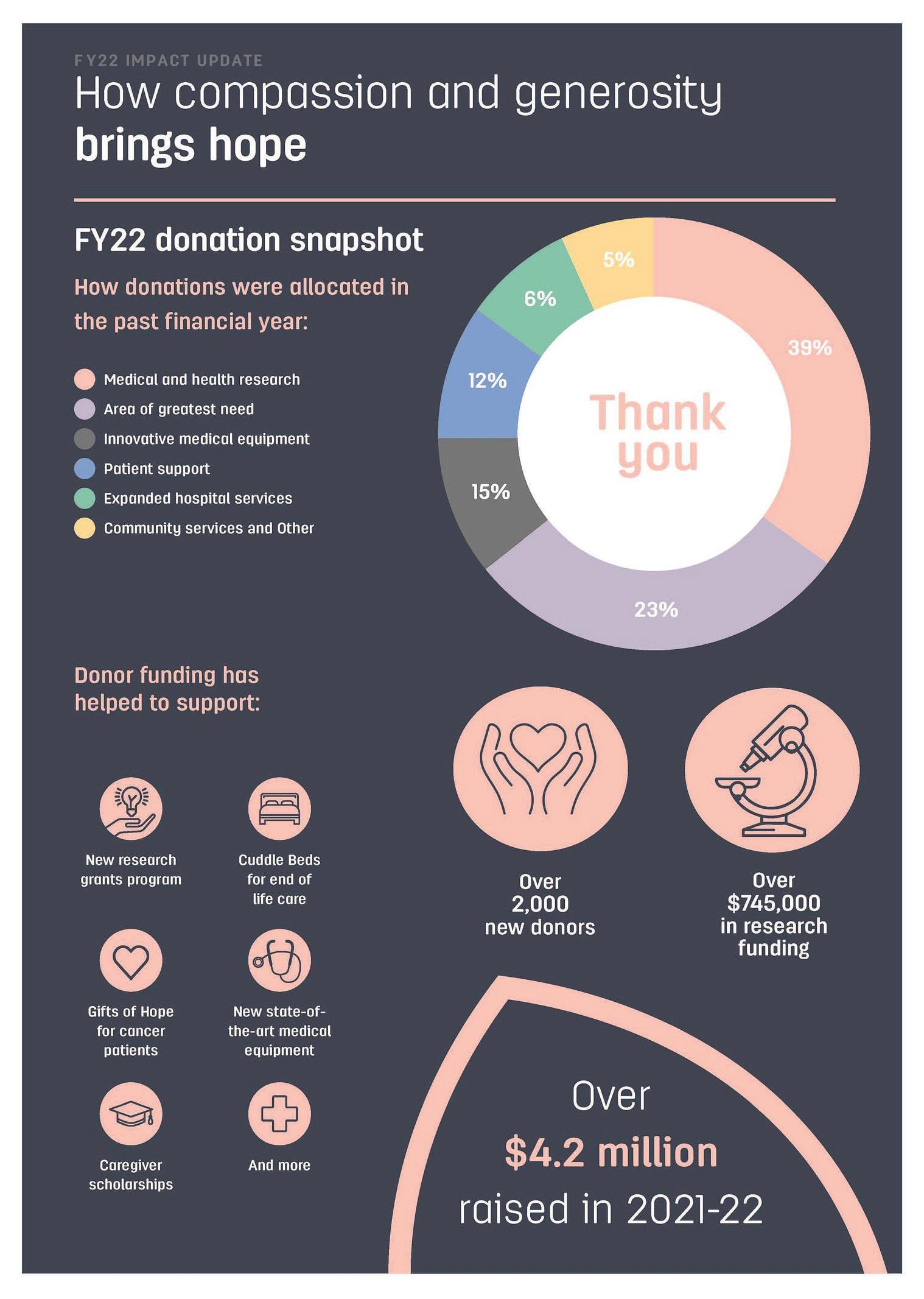 Through generous support from the community, over $4.2 million was raised in FY22 – to help us continue to bring healing, hope and a greater sense of dignity to people in our care.
