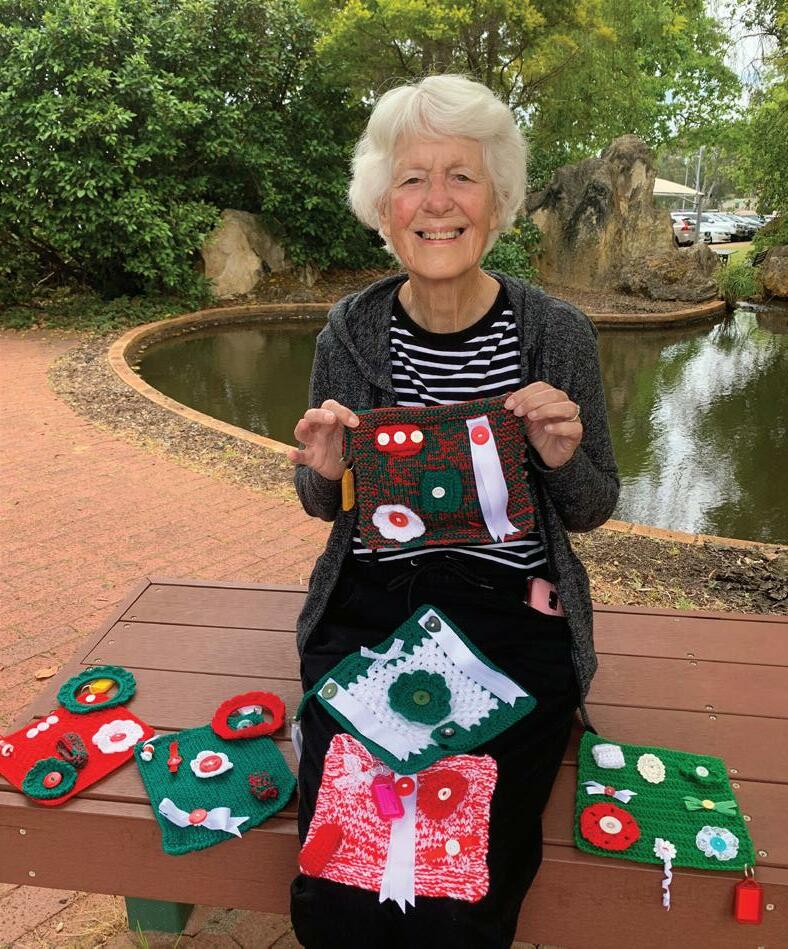 fiddle squares with her! She is pictured here with some wonderful Christmas themed squares which she dropped off to the Hospital, for patients over the holiday period.