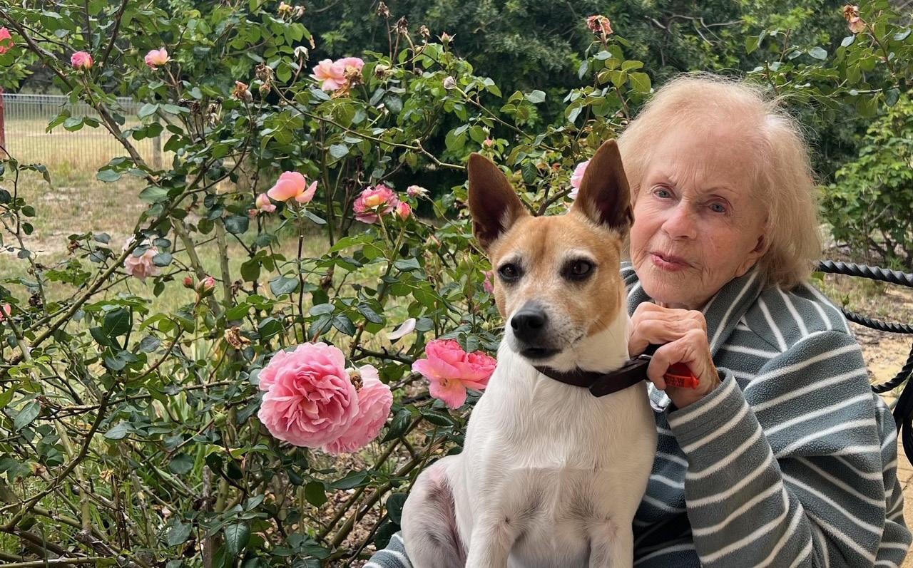 Mrs Greaves underwent the total left hip replacement in early Spring, and is now at home, comfortable and in good spirits, tending to her all-time favourite rose, Pierre De Ronsard (pictured below, with Archie).