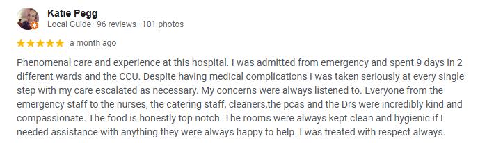 Highly skilled attentive staff. Although under high pressure, they give compassionate care, paying attention to even small details of a patient's wellbeing. I would not go anywhere else.