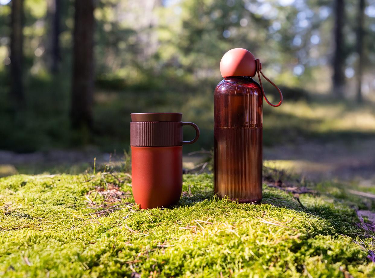 populære termokopp Ted i vakuumisolerende rustfritt stål, og den lette og stilrene vannflasken Ture i rPET med lokk i resirkulert PP.